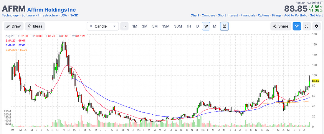 They’ve missed the greatest wealth transfer in history because they're using 1929 logic in a 2025 market. The reality is that the game changed in 2008. Central planning became the norm through monetary policy… Every liquidity event has been met with accommodation. Because in the post-Ben Bernanke world at the Fed and other central banks - the real mandate isn’t inflation targeting or maximum employment… It’s financial stabilization… at pretty much all costs… Even societal… A reminder of how good Paul Giamatti was as Ben Bernanke in Too Big to Fail… And the basis of everything we see today in policy… [Note: When you watch this… Interestingly, he sounds exactly like Heath Ledger’s version of The Joker - in both cadence, voice, and mannerisms.] Back then, the Fed discovered the power of infinite printing. Everything is inflated… because of the Money Printer (a euphemism for loose fiscal and monetary efforts)… and because there’s an entire world of liquidity that a lot of people won’t accept as fact… If you want to say something like this, I could agree… that maybe the U.S. is the bubble. And that the growth of U.S. debt is part of the equation here… Since we started pumping liquidity into the system in the last 15 years, QE and these pro-growth stock market outcomes have sucked more money back into the U.S., which feels like a paradox… because it is… I explained how we’ve behaved since 2008… and I don’t expect things to change… Will there be another crash? We’ve had a few major ones in the last six years, but central banks fear deflation; they allow leverage through the Basis trade and pump U.S. debt issuance into the cryptocurrency markets… They won’t allow massive defaults or deflation… They’ll keep doing this… I explained it all after the Nikkei Crash last year… Ultimately, it will create serious problems that may even lead to revolution. But not today… Took about 70 years to go from the Mississippi Bubble to the French Revolution… When liquidity's flowing, momentum's building, and insiders are buying, you ride the wave. Then, ensure that you allocate some gains to real assets, which will also appreciate because the money is worth the cotton it’s printed on in the long run. This isn’t complicated… Stop trying to make it complicated… More Signs of BRRRR…I couldn’t help but notice that America’s top Buy Now, Pay Later company has absolutely ripped into the stratosphere. Sign of the economy that Affirm (AFRM) popped 10% on earnings news? Or is it a result of liquidity cycles? As I’ve noted, the markets loved Affirm at the backside of the 2021 rally. Michael Howell’s cycle peaked at the time… And then, the slow death march of 2022 began - higher rates, tighter conditions... Affirm has been hit every time the signal has gone negative in recent periods, rolling into trouble during the Nikkei Crash and contributing to the excess liquidity drain that exacerbated the 2025 trade crash. Then… what happened? The Fed adjusted its QT program again, the Treasury shifted more focus to T-Bills, trade policy was canceled, and economic conditions continued to loosen. So, it’s no wonder that Affirm has become what it really is… a stock front-running liquidity expectations. And if you don’t think that’s the case… consider this thing imploded alongside so many other credit companies on the backside of 2022. When the cycle bottomed out, it left behind a wake of nearly dead consumer credit companies - Affirm (AFRM), Lending Club (LC), and Carvana (CVNA)… What have been the returns of these stocks since the start of the 2023 upward liquidity cycle? Affirm is now up 869% since the end of 2022… Carvana is up 3,610%… And Lending Club… well… just 78%… As if that’s bad… ha… But you get the point… It’s not because they’re great, world-changing companies… It’s the loose economic conditions… This isn’t a coincidence. Remember - next time the markets collapse, insiders start buying stocks, a policy pivot happens, and momentum returns… Buy Affirm. Even if you don’t want to… And don’t worry… it will collapse again… But not yet! The AI LoopholeI think the bigger AI story today wasn’t around China… It was south of the border… Big Tech found a loophole in Mexico. Can't build data centers in California because there's no power? Move to Querétaro. Microsoft, Amazon, and Google are pouring $10 billion into Mexican data centers over the next decade. Why? The U.S. power grid is hitting capacity constraints... AI needs electricity. Mexico has power, cheap land, and politicians who to do business. But there’s something else that has fallen under the radar… Data centers don’t just suck up power… They suck up TONS of water… Google alone sucked down 8.1 billion gallons last year, a 28% annual jump. That's for cooling servers so ChatGPT can write your emails. The locals get the jobs. Big Tech gets the power. Mexico gets the investment. And when drought hits? Well, servers need water more than people need showers, apparently. Welcome to AI's colonial era… Same extraction patterns… just a different century. Finally - Thank You…Some exciting news after a really difficult June and July… In August, Me and the Money Printer received a lot of recognition and gained new readers… and we’re very thankful to everyone for signing up and being part of this community. Today, this letter reached No. 3 on the Rising Bestsellers in Finance list. Thanks to our supporters and subscribers, we look forward to building this audience independently in the future. I hope you’re entertained… and you’re getting a lot out of this too… That’s one reason to… Stay Positive, Garrett Baldwin About Me and the Money Printer Me and the Money Printer is a daily publication covering the financial markets through three critical equations. We track liquidity (money in the financial system), mom