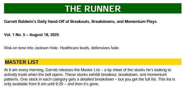 | What if you could see the exact moment a stock is about to erupt? That's what Gianni's Freeze Points reveal — catching setups across AI, crypto, and biotech, with gains like RDDT +186% and IONQ +59%. Click here to reserve your spot for Wednesday. | | | Good afternoon, | Mondays have a way of sneaking up on you. You prep all weekend, run through the charts, line up the notes, test the links… and then the clock strikes 8:45. The lights are on, the show is live — and one fat-finger slip means the link is busted. | That was me this morning. If you couldn't make it into the room, that's on me. | Normally, The Runner is reserved for the live chat between 9:00 and 9:20. But since this was my mistake, I want to make it right. Here's today's Runner: |  | (click to download) |