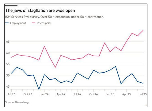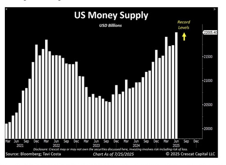 In short… Chart 6: And Then We Wonder…This is the meme going around about inflation that is slightly off… but feels on par with how conditions are in the United States. I’ve said that there are issues with the beef industry right now - smaller herds, drought, aging farmer populations. But… there’s an important thing that people have to understand. Input costs (feed, electricity, etc.) are going up… Output costs (the price of beef) are going up… That’s not supply chain or supply side driven. Monetary inflation and the phenomenon of inflation from a policy side is very real… and it doesn’t matter how many times Janet Yellen lies about it… they printed too much money. Chart 7: Proof They Printed Too Much Money…This is just the U.S. money supply… Submitted without a lot of commentary… More importantly, it doesn’t include the shadow banking side that is heavily influenced by Fiscal policy… And we wonder why stagflation is a threat… Chart 8: This is TerrifyingPrices up… employment down (thus wage inflation not keeping up… If this trend continues, the midterm elections could be mayhem. Chart 9: And Yet…Despite the concerns about inflation and stagflation… Markets actually expect that the next Fed Chair will need to engage in new forms of Quantitative Easing or Yield Curve Control… There will need to be some sort of yield compression to address the rising deficits… Which again… is bullish for stocks… and keeps the K-shaped recovery going… Buy hey… LOOK AT THOSE DOGE SAVINGS… HAHAHAHAHA… Buy real assets… buy things that matter… own land and gold… Chart 10 - And Finally… Past Performance Does Not…Nice little chart here… historically, since 1990, things get a little more intense heading into the Jackson Hole Symposium and September. With liquidity strong, financial conditions supportive, and markets at all-time highs… remember that the purpose of a market is to sell… But I don’t like shorting unless there’s something significant happening. We have moved back into positive momentum conditions on the Russell 2000… And we’ll be watching two things in the next few days… First… go back to what we talked about above with LEVERAGED ETFS. The Direxion Daily Small Cap Bear 3X Shares (TZA) is a very important clue on the small-cap side. It goes up 3x for every 1% that the Russell 2000 Index loses…Look at the 20-day and 50-day EMA. If we break about those levels… that’s where I’d get jitters… Meanwhile, the FNGD is our leveraged FAANG ETN, which is a warning sign on leverage unwinding at the top of the S&P 500. If that breaks its 20-day moving average (to the upside) then you might want to speculate on more volatility. I prefer to wait for confirmation of it breaking above both its 20-day and 50-day moving averages. The last three times it has happened, we had the Nikkei crash last August, the China deflation scare last September, and the most recent market downturn starting in February and carrying into April. That’s our canary… And there’s good reason to expect something big at some point… The Mag 7 stocks are easily the most crowded trade on Wall Street… For now… the bird is still breathing… If you need me, I’ll be at the pool today, still gathering my tax documents… I hope you have a great Saturday… If you’re not a member of the Capital Wave Report - please consider… If you thought this free commentary was great… wait til you see what I write about each morning. Oh… and just for reference… The Subhead from today’s article was from Me, Myself and Irene… Stay positive, Garrett Baldwin About Me and the Money Printer Me and the Money Printer is a daily publication covering the financial markets through three critical equations. We track liquidity (money in the financial system), momentum (where money is moving in the system), and insider buying (where Smart Money at companies is moving their money). Combining these elements with a deep understanding of central banking and how the global system works has allowed us to navigate financial cycles and boost our probability of success as investors and traders. This insight is based on roughly 17 years of intensive academic work at four universities, extensive collaboration with market experts, and the joy of trial and error in research. You can take a free look at our worldview and thesis right here. Disclaimer Nothing in this email should be considered personalized financial advice. While we may answer your general customer questions, we are not licensed under securities laws to guide your investment situation. Do not consider any communication between you and Florida Republic employees as financial advice. The communication in this letter is for information and educational purposes unless otherwise strictly worded as a recommendation. Model portfolios are tracked to showcase a variety of academic, fundamental, and technical tools, and insight is provided to help readers gain knowledge and experience. Readers should not trade if they cannot handle a loss and should not trade more than they can afford to lose. There are large amounts of risk in the equity markets. Consider consulting with a professional before making decisions with your money. |