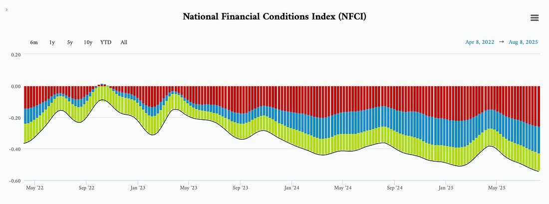 You are a free subscriber to Me and the Money Printer. To upgrade to paid and receive the daily Capital Wave Report - which features our Red-Green market signals, subscribe here. It's Time to Chart Party... (No. 4 is Nuts)I just took a deep breath, counted backwards from ten and I said to the guy, "Excuse me, sir, but your laughter is not helping me right now." And he said, "I'm sorry, I didn't mean to make fun."Good morning: My wife and daughter have taken a trip to visit family in North Carolina… Which means that I am sitting on the couch - for as long as possible - engaging in the nerdiest and most blissful thing there is… Charts. Charts! Charts! Charts!!! So, we’re going to go through A LOT of charts today… And some won’t require too much commentary. We start with the sheer lunacy of our financial markets… Chart 1: This Is What Our Engineers DoAs I’ve said, there are better incentives these days for people to launch ETFs than to build a bridge, start a business, or make anything in this nation. Just raise a pool of capital, buy a bunch of stuff… and then collect an expense ratio. Everyone is doing it. According to Finviz, there are 5,533 publicly traded stocks… And 4,436 ETFs… they’re all repackaging the same stuff or just levering up positions on single stocks or index funds with swaps. And then taking daily fees… Since 2024, there have been more than 1,300 new ETFs. And the ones with the highest inflows… what are they “trading…” Don’t try to make sense of most of the assets in these ETFs, or you’ll get a bloody nose, slam your head into the desk, and you’ll wake up in an ambulance. Chart 2: It Gets WorseNow, you don’t see a lot of leverage in these ETFs above. Which is good news for the sane… until we dig a little deeper. Total assets now in equity exchange-traded products (ETFs and ETNS) just hit $140 billion. And no doubt about it… we got clear evidence of how these tools are being traded (read - front run) out of Washington D.C. Recall, right before Liberation Day was canceled… we saw RECORD volume around the ProShares UltraPro QQQ (NASDAQ: TQQQ), which is a 300% leveraged ETF tracking the Nasdaq 100. I don’t believe in coincidence. Watch these funds… watch the money flows… because big events are happening after the volume spikes. Again, I don’t believe in coincidence… Chart 3: This Has Never Happened BeforeFrom record buying on April 8-9, around the TQQQ (a day after people were warning about another Great Depression), to the monstrous V-shaped recovery that’s happened. Historically, after 20% drawdowns, this is the FASTEST and SHARPEST recovery in history over the timeframe. What is the lesson here? We’ve had multiple sharp drawdowns like this going back to 2008. Every single drawdown… follows the same pattern and offers us the same clues in terms of when it’s time to buy back in… Sharp insider buying activity (CEOs and CFOs have called the bottom of every downturn since the start of QE in 2009). Then, we look for policy accommodation… (on monetary, fiscal, trade, or anything designed to reintroduce stability and confidence. Sometimes, it’s subtle… so watch the insiders.) Follow the 1% pattern that I’ve laid out… Chart 4: Overvalued… YOU’RE OVERVALUED…Right now, of Money Managers (according to Bank of America) believe that stocks are overvalued. Who are the 9% who disagree? I want to hang out with these guys… Because they might understand that it’s really a measurement of leverage and liquidity that continues to drive the S&P 500 higher. And… are they like me, where they look down to the Russell 2000 and see dozens of energy stocks (upstream) trading for less than their book value… or the hundreds of banks trading for less than their tangible book value… That incentives… easing… and massive gobs of liquidity are domestically forcing equities higher - and managers are crowding the S&P 500 because they’re tracking their benchmark… And before you tell me that we’re not easing right now in the financial markets… Chart 5: Ahead of Jackson HoleHere’s your measurement on economic conditions in the United States… Believe it or not… we’re effectively running the loosest financial conditions in the post-COVID era… Gee… “How can stocks be at all-time highs?” the pundits ask… Because if you turn the Chicago Financial Conditions Index upside down, it’s just an inverse reflection of the S&P 500 since COVID. See all that red? That’s risk expanding… See all that blue? That’s credit expanding… See all that green? That’s leverage expanding… The market is supposed to predict growth over the next six to 12 months. But it doesn’t seem to do this now... It’s reacting to liquidity flows in real time. Since 2020, stock prices have stopped caring about silly things like "profits" or "growth." Here’s what moves markets now: