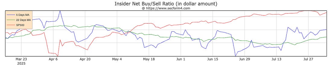 I want to say hello to many new subscribers and readers. I was very fortunate to join The Compound with Josh Brown yesterday. And some new faces have joined us. If you’re new… welcome. This is the Capital Wave Report - the market publication of The Money Printer Substack. Me and the Money Printer - which is a bit more off the wall - comes out later in the day… today’s subject will be… the No. 1 Financial Headline of 2025. But… this letter is designed to sniff out liquidity and credit events, track insider buying activity, and avoid sharp downturns. It comes out every morning around 8:15. Think of it as a Morning Surf report providing up-to-the-minute conditions… This letter has allowed us to stay safely ahead of the things most people in the media can’t see… and we’ve successfully stayed out in front of the COVID crash, the GILT Crisis, the SVB Crisis, the Nikkei crash… and the trade slump in April. What we’re looking for… is this pattern. It can save and make you a lot of money… As I said yesterday, the story of the world is told through the markets… Good morning: Last Wednesday, I led an education session on Tesla stock trading, walking through the mathematics behind the Fed-driven selloff. All of a sudden, the Russell 2000 took a serious bath - reminding us that it only takes one simple policy statement to unwind countless positions and send retail and institutions into a tizzy. Selling pressure in the Russell 2000 accelerated - with lots of stocks dropping more than 5% in a very short period (measured over a few days with specific coefficients) - and a lack of buying pressure to match… implying little rotation at the time. Our Russell 2000 signal turned Red on Thursday morning. And we remain under pressure despite yesterday’s little pop. The Russell has since pushed back to 220 and will now look to retest its 20-day EMA. (It’s technically Yellow, but the MFI is just 41.5). Meanwhile, the S&P 500 is dancing back above its 20-day EMA… all while insider buying-to-selling in total dollars didn’t breakout. The blue line below - the most important in all of finance - is the five-day moving average of buying to selling in dollars. The higher it goes, the more bullish it is. You’ll notice that it peaked out around April 8, right when President Trump called off Liberation Day. This had followed the previous week’s decision by the Fed to reduce its Quantitative Tightening pace from $25 billion per month to $5 billion. At the same time, it continued to conduct a large number of rollovers on existing liabilities. Anyway… the insiders bought the bottom… just like they have at the bottom of every major crisis dating back to 2008. See those spikes? They all aligned with a massive policy accommodation by a central bank to stabilize the system… What’s The Outlook Here?The Federal Reserve is tilting dovish after soft U.S. jobs data. Rate‑cut odds for September have surged toward 90%, setting the stage for short-term stability in equities and bonds over the next few weeks... I feel as though this market could simply go sideways until we get meaningful data in the coming weeks. All a lead-up to Jackson Hole event... However, the narrative’s starting to get bearish again. I’m not doing anything until I see some direction here on our signals. I wouldn’t short the S&P 500 until… The FNGD breaks above its 20-day and 50-day moving average… just saying… That’s where it’s clear that deleveraging is happening… and that’s where the worst of it comes… and fast… I know a lot of people watch the VIX. That said, Evercore has now warned of a 7% to 15% correction. They cited… wait for it… stretched VALUATIONS… This always makes me snicker. That sort of drawdown would likely come from a drain of liquidity from the system, deleveraging, or interest rates rising and impacting collateral quality. And a 15% move down will likely be met with some sort of accommodative policy… That means… BRRRRRRRRR. I don’t pay attention to valuations at the S&P 500 level very much anymore… I just pay attention to how much freaking capital is sloshing around… and the Repo market… and whether or not some bank in Japan is about to blow up… any day now. And what incentives are created by a financial system where: