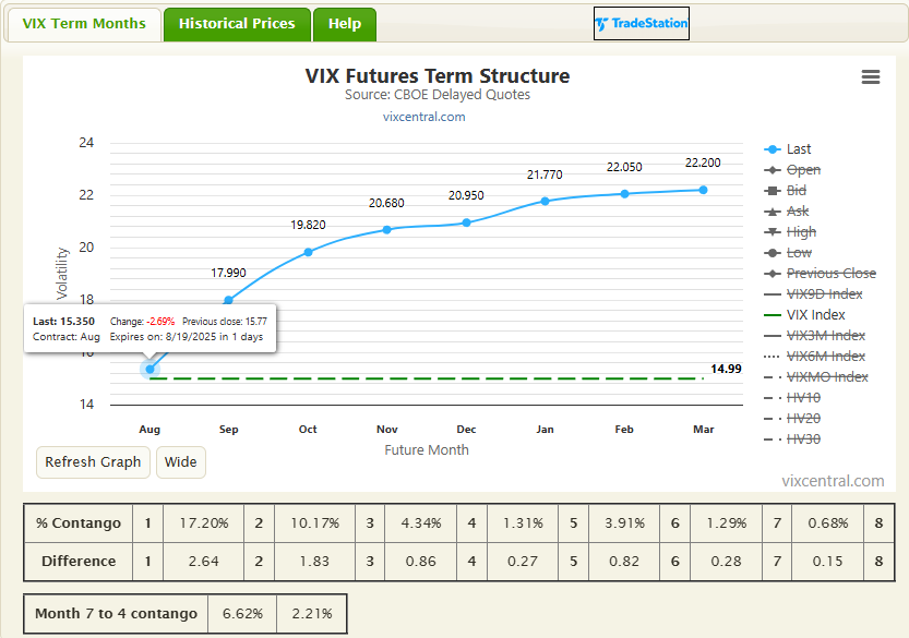 September VIX futures are trading at 18. October's at 20. Take the average and you get 19 - that's 23% higher than the current VIX at 15. |