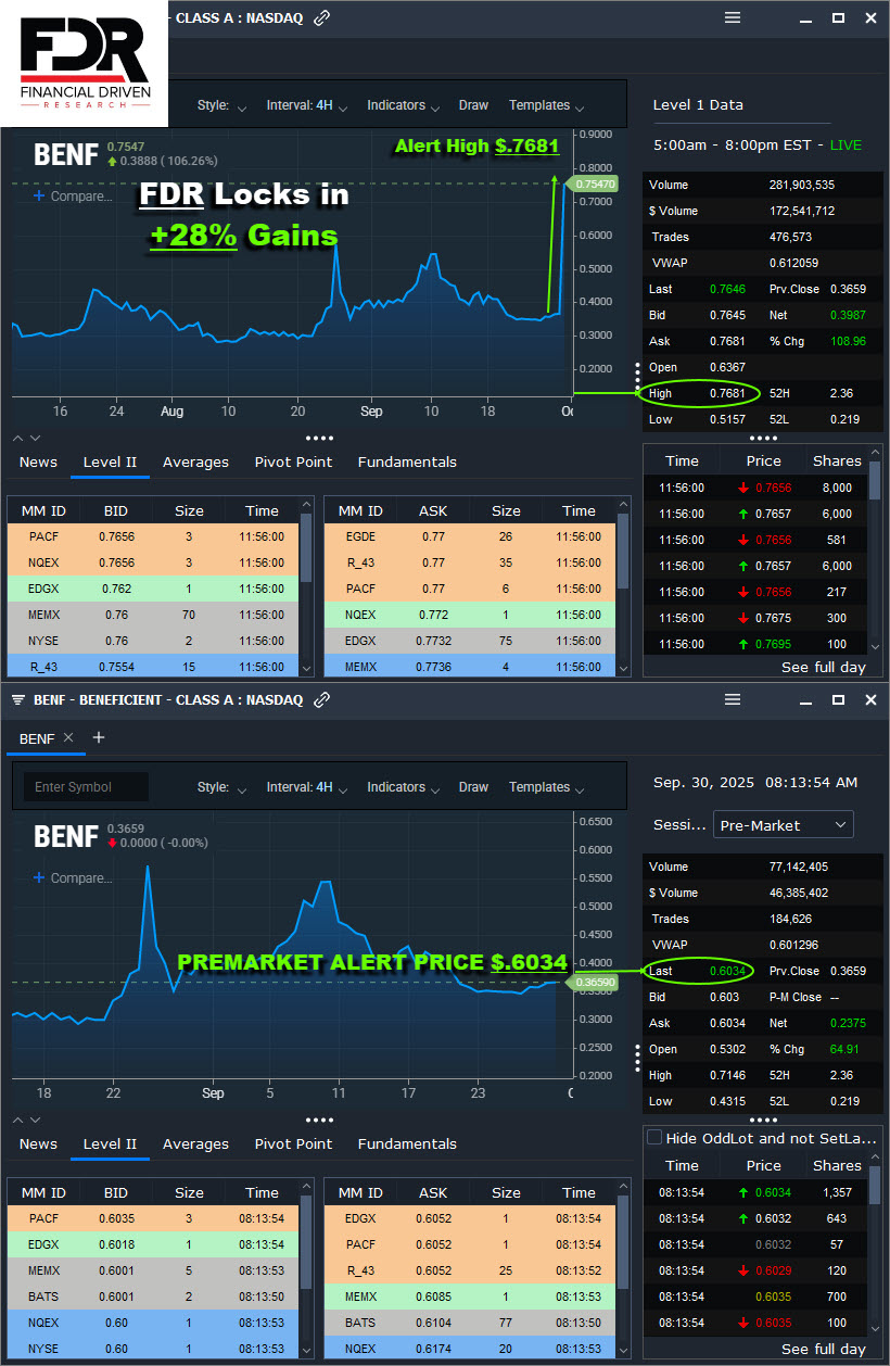 I first alerted BENF on Tue. September 30th, premarket at approx. $.6034/share, and it rocketed to a staggering high of $.7681/share today, showing traders +28% in gains.