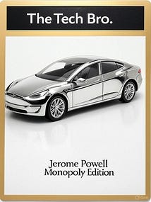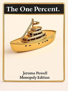 The title: Modern Monetary Monopoly. It wasn’t a left or right article. It was an up-and-down one. We have turned our entire economy into a board game… one built on extraction. While everyone was drunk on stimulus checks and meme stocks, I wrote about what happens when you fuse Monopoly with Modern Monetary Theory. Three years later, and we're seeing the monster overwhelm everything… Now, Parker Brothers called… and they want their game back before we destroy it. I propose we return it and recreate the game to current standards… Call it The Federal Reserve Chairman “Jerome Powell Special Edition.” This version of Monopoly isn’t the same as the one your grandfather played… But, ironically, he’s one of the few people who can afford to play the game anymore… In the Jerome Powell edition, the rules change every time someone important looks uncomfortable, the money printer never stops, and the bank is run by an 8-year-old named Timbo, whose father owns the Park Place property. Timbo insists he's "independent" while wearing a Goldman Sachs shirt with a Batman cape. He can't pronounce "quantitative easing," but he knows how to print money when dad's properties are in trouble. Now… before we begin… a few important details… The board has been "adjusted for inflation…" Everything costs more and more each time (one year) around the board… But the GO square still and ALWAYS pays $200 because we’re told that wage growth will cause inflation (not… all damn money printing that will occur in this game.) Also… players must stand and pull up their bootstraps every time they pass GO... (Disclaimer: Bootstraps sold separately.) Many other things are different about the Jerome Powell Edition of Monopoly… For example, the hotels have all been acquired by private equity firms before the game starts and converted into REITs for greater tax efficiency. The dice are also loaded, but only Players 1 and 2 know which numbers come up more often. Speaking of which… let’s meet the players… Meet the PlayersPlayer 1: "The One Percent"Golden Yacht Token Player One is the Modern 1%. They start not only on third base, but they also begin the game owning Park Place, Boardwalk, all railroads except the Shore Line, and both utilities, which appreciate every turn due to increasing AI demand. Starting Cash Receives $15,000 (plus Cayman Islands account that he can draw from) Starting Assets Owns an additional $10,000 in Collateralized Debt Obligations (CDOs) used to bet against the values of Players 5-8's properties. Starting Debt None Special Advantages Player 1 knows about monetary inflation before it happens, receives new money first through the Cantillon Effect, and creates mortgage-backed securities from other players' properties. When Player 1 gets in trouble, they can pause the game for a month and declare themselves "Too Big to Fail" while other players sell their properties to raise cash. Finally, Player 1 can stop any other player from advancing across the board to provide them a lecture about the importance of smart regulation (which is just regulatory capture that benefits them). Player 2: "The Tech Bro"Miniature Tesla Car Token Player 2 disrupted the original “Race car” token and is now speculating on the other best properties on the board, which will be used to maximize cash flow through arcane partnerships and LLCs that only an AI accountant can understand. Additionally, they own the AI accounting software and have deployed it on behalf of their preferred politicians to gain favor as well as to undermine political opponents. This player starts the game owning all green properties (Pacific, North Carolina, Pennsylvania). It is essential for this player to consistently remind everyone that their properties are “Green,” even though these properties consume more electricity than all other properties combined. Starting Cash $5,000 liquid, $50,000 in unvested stock options that never mature. Starting Assets Player 2 owns NFTs of all other players' properties Starting Debt Unknown, but lawyers are based offshore and won’t answer questions. Special Abilities Player 2 is also aware of monetary inflation in advance. This player benefits from the Cantillon Effect second, receiving money through Player 1’s reverse repo operations. One of the biggest advantages that Player 2 has is that they can "work remotely" and collect $200 from anywhere. Additionally, every property they acquire becomes an Airbnb rental, which requires an extra cleaning fee that they pocket without bothering to clean the place. Finally, Player 2 receives three chances per game to "pivot to AI," allowing them to return to Go and collect $200 from Player 1’s investment fund. Player 3: “The Boomer Retiree”Original Iron token due to refusal to upgrade The Boomer Retiree starts the game with all three red properties, which they purchased in 1975 for a total of $12.. Starting Cash $3,500, plus a pension that no one else will ever see Starting Debt None (properties were paid off in 1987) Special Abilities: The player's properties are locked at 1978 tax rates, and they collect Social Security ($100) plus regular GO payment, while failing to thank any other players for that money, even though the Gig Economy worker (Player 6) is basically paying that social security payment on their own. A huge benefit is that they’re allowed to provide predatory credit to eliminated players. They can also bore other players into submission with stories about housing prices and lectures on interest rates from the 1970s. Player 4: "Dual-Income-No-Kids"Token is a Tiny Avocado The Dual Income No Kids players team up to own Atlantic and Ventnor Avenues at the start of the game. They are very health-conscious and see that raising a child in these economic times can be a form of financial masochism without abundant resources. They’d rather have avocado toast. Starting Cash $2,000 (would be more, but they order from Uber 