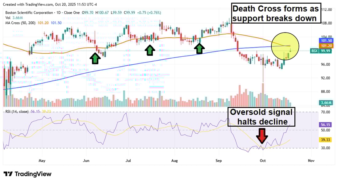 The chart highlights the market shrugging off BSX's results, and now any remaining momentum appears to be cratering completely. The price broke through a key support level at the 50-day simple moving average (SMA), taking out the 200-day SMA on its way down. |