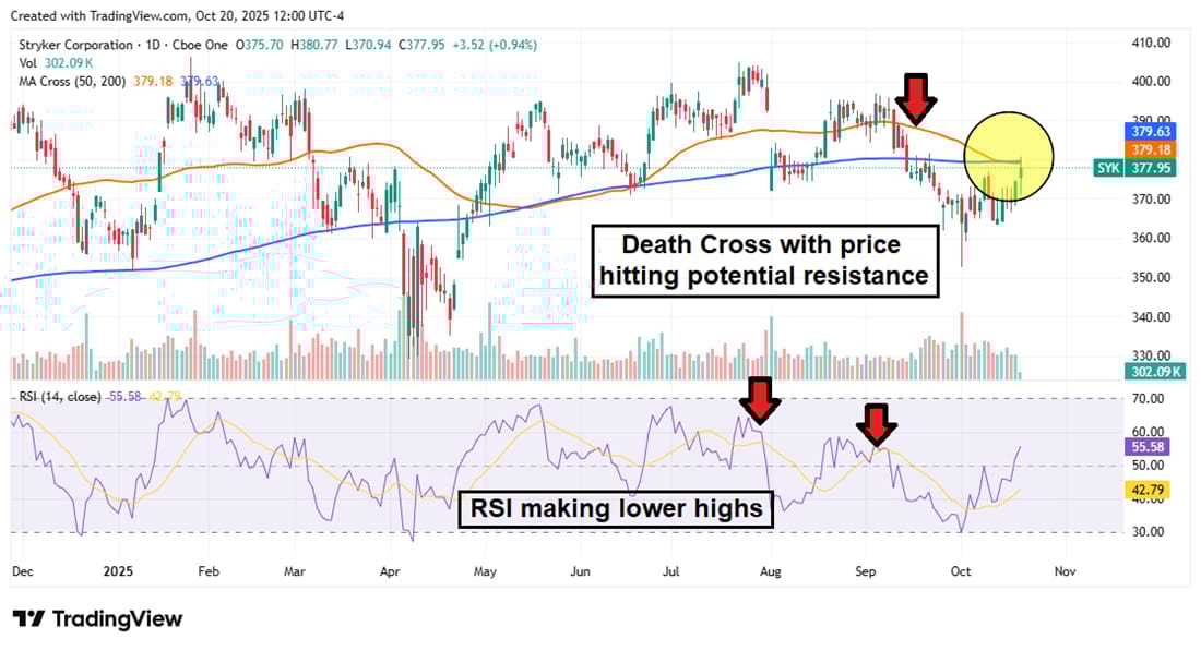 The SYK chart shows that the next few sessions will be crucial. A Death Cross is forming as the price approaches the 200-day SMA, a previous area of support, and the RSI suggests momentum is weakening. If the price is rejected at the 200-day, there's likely more downside for SYK shares. |