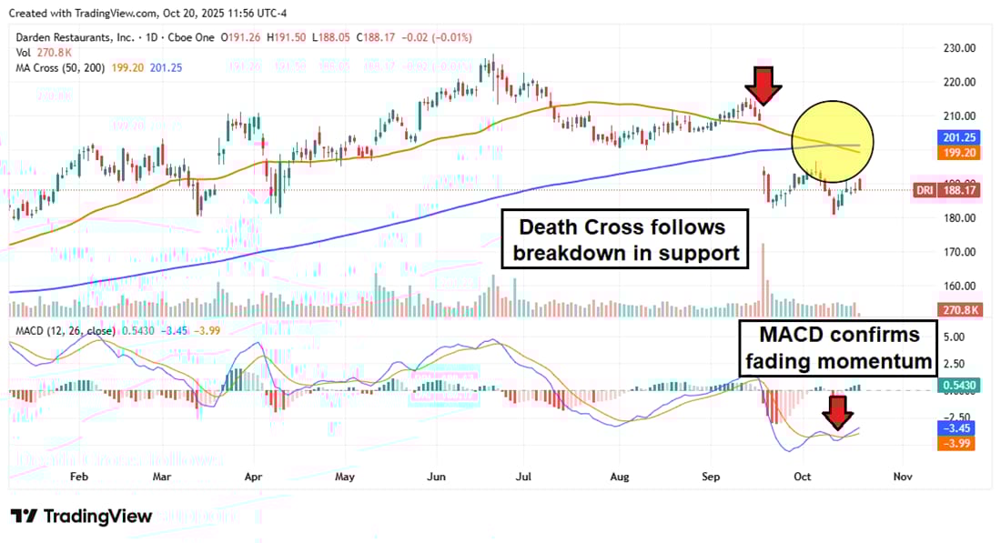 A Death Cross is a bearish signal formed when a stock's 50-day moving average drops under its 200-day moving average. The Death Cross often precedes bearish momentum swings, but it's a lagging indicator that must be used with fundamental and technical research. These three stocks recently had a Death Cross strike their charts, and a deeper look shows all three facing other headwinds.