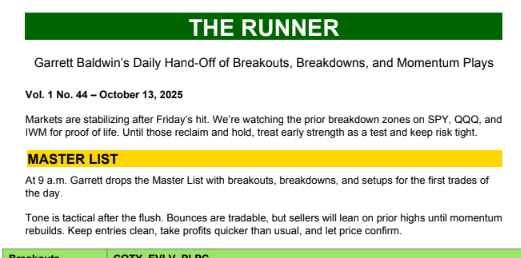 | | | There's the moment before you crack the code… And the moment after. For some traders, today is that moment. Click to see how. | | | Good morning: | In 15 minutes, I'm going live. | We'll discuss the Trump trade… volatility… and more… | This is going to be a wild 24 hours for the market. The bond markets are closed… and it's impossible to weigh data with the government shut down… | So… let me teach you how to trade and invest on a day like today… | Plus! My cheat sheet… The Runner… is FREE at 9 am. | | I'll be in this room at this link in 15 minutes… | Jump aboard… | Garrett | | | |