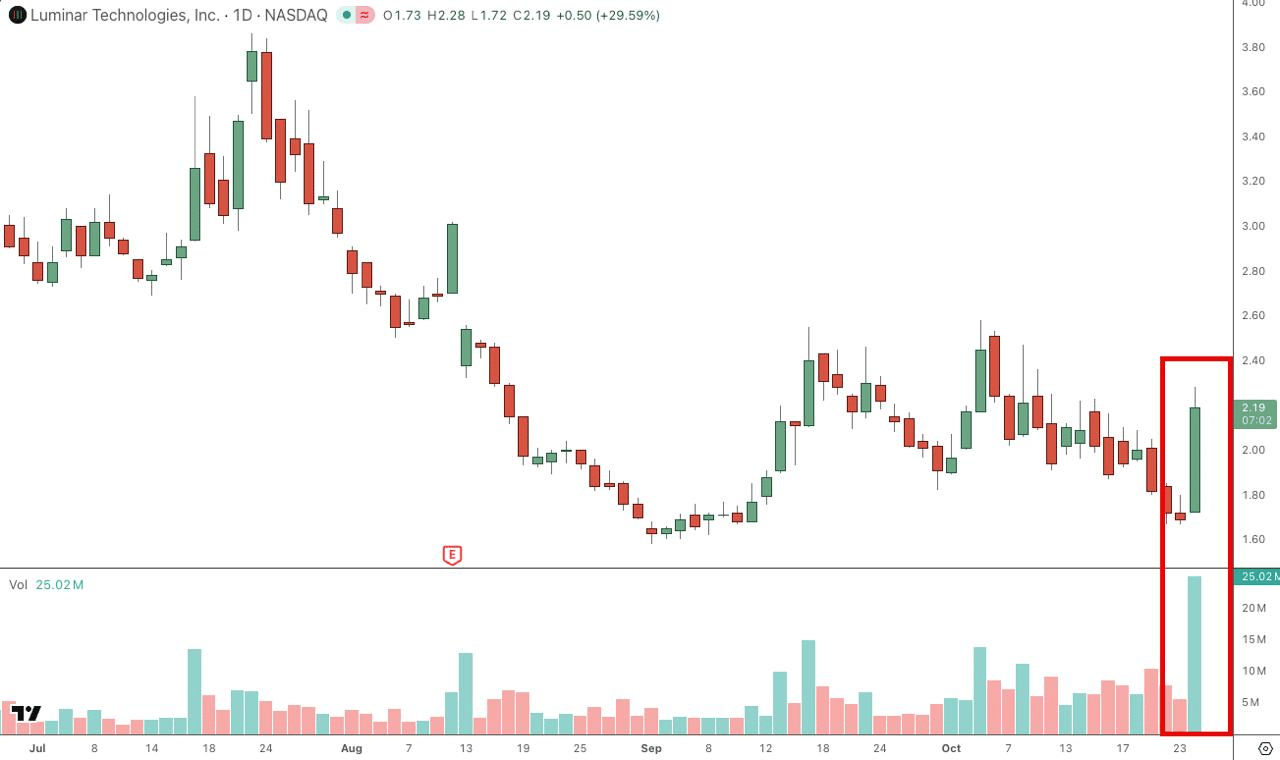 LAZR exploded 29.59% higher to $2.19 on October 24th. Volume surged to 25.02 million shares, dwarfing the typical daily range. |