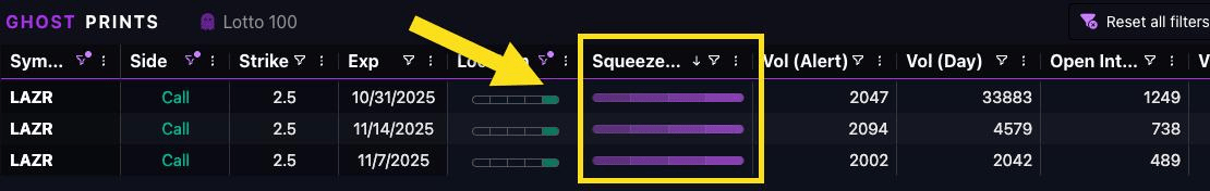The stock displayed that critical purple squeeze bar in the console. This meant LAZR had the exact characteristics that fuel massive short squeezes. |