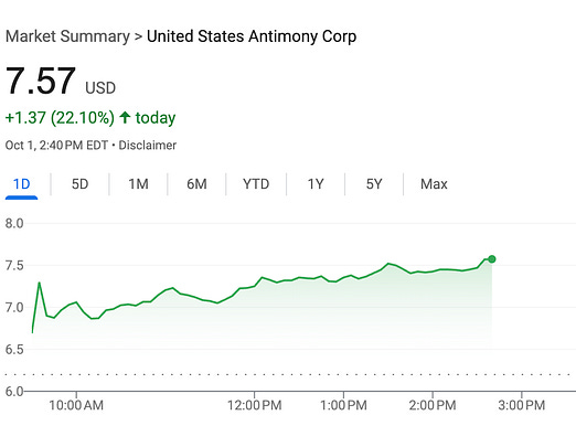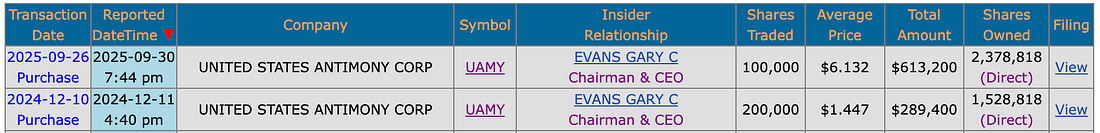 You are a free subscriber to Me and the Money Printer. To upgrade to paid and receive the daily Capital Wave Report - which features our Red-Green market signals, subscribe here. Dear Fellow Traveler, The CEO of United States Antimony has just invested $613,000 of his own money in company stock at $6.13 per share. This was at an all-time high… The last time he bought the stock… it was at $1.44 per share in December… He still bought it - 100,000 shares - at over 4x the previous purchase price… Plus… he didn’t buy options. This wasn’t about RSUs. He used cold, hard cash to purchase common stock. This follows a pattern I’ve tracked for years. You see… insiders and government contracts go hand in hand… The Intel PlaybookIn mid-2022, Intel (INTC) insiders - particularly directors and senior VPs - accumulated shares ahead of major CHIPS Act announcements. The government later awarded Intel $8.5 billion in grants and $11 billion in loans. They weren’t betting on quarterly earnings. They were front-running federal industrial policy. The same happened with MP Materials. There, insiders accumulated heavily in late 2020 and 2021, just before becoming the sole recipient of Department of Defense rare earth refinement contracts. The U.S. needed a domestic alternative to China. MP executives knew it before the market noticed. And now there’s the Nuclear Trade