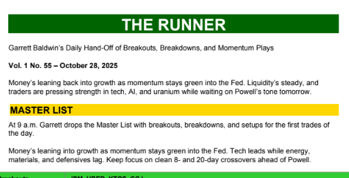 | | | It started quiet. Then the block trades hit. Pressure like this doesn't sit still for long. You either catch it early or watch it run away. Click here and see why. | | | | Good morning: | The FOMC starts today… and we're looking for a 25-basis point cut by tomorrow. | What else is on tap? | It's a busy morning. Uranium's jumping on new U.S. energy deals, PayPal's higher on AI headlines, and crude's slipping again. Tech's still leading, and traders are already setting up ahead of Powell's comments tomorrow. | That's why we're up each day at 8:45 ET to walk you through the top stories and to give you the top trades. | Each day we peel back the headlines, tell you what tickers you need to watch… and give you access to our breakout and breakdown stocks… | | What do you need to do? | Just take the ideas and execute. | We'll be live in 15 minutes… so go grab your coffee, water, or tea… | And I'll see you right here… | Stay positive, | Garrett Baldwin |
