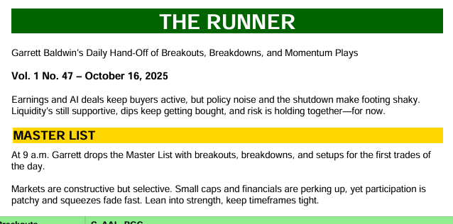 | The markets are moving fast, and the opportunities are real. | Join me live to get the analysis you need to navigate these wild global markets. | And as always… The Runner drops at 9am. | | See you on the show. | Garrett Baldwin | Market Masters |