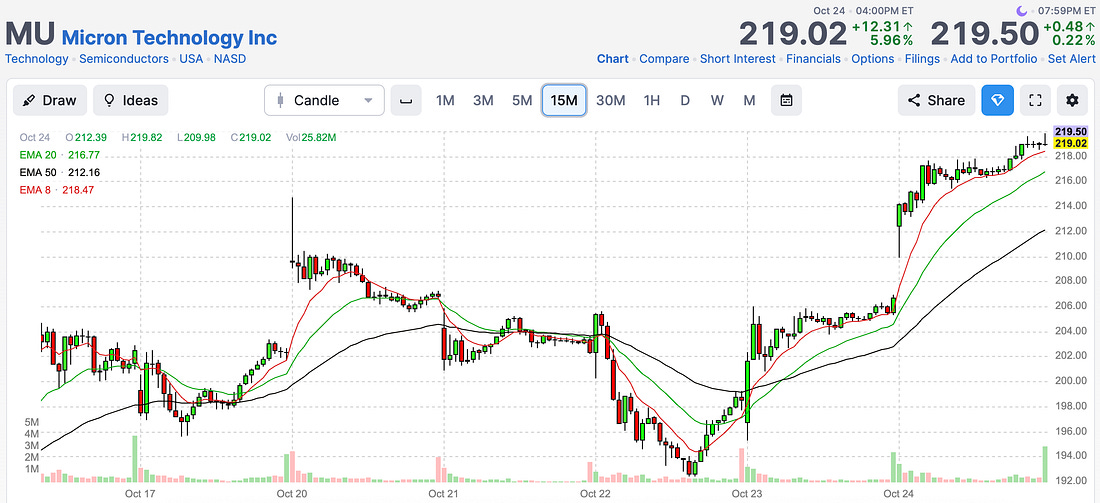 Good evening: I wanted to add a little bit of flavor for the people who are traders… As you know, I host a morning show at TheoTrade each morning at 8:45 am. The link is right here… So… let me tell you right now - up front - the five stocks that I’m trading this week - why… and how. I am focused on momentum… This isn’t about insider buying… With our signal positive, I’m going to take direct aim at these five stocks using a pretty simple strategy… I’m turning to the 15-minute chart of each stock. I’m mapping the ADJUSTED 8-day exponential moving average (EMA) and the ADJUSTED 20-day moving average. And when 8-day moving average moves under the 20… and the equity price breaks above the 20-day EMA… I’m either buying the stock or buying the at-the-money call that expires on Friday. If the stock breaks back under the adjusted 20-EMA, I walk away… I take a small loss… But if it breaks higher… I’m staying in the position… Here’s Micron Technology (MU) this week… The $197.50 call on Wednesdays at 2:30 - when the stock pushed above its 20-day was about $7.90. It finished the week at $23.20. Now, again, I can use the stock or a leveraged version of the stock. Oh… and I can also short the stock when the 8-day EMA falls under the 20-day too… Anyway… this is my watchlist of breakout and breakdown stocks, based on this chart. And if you’re a day trader, bring it down to the 3-minute chart for faster moves. My list this week—consisting of high-volume stocks with tight Bid-Ask spreads—includes stocks that are within earshot of all-time highs… That’s important because they can break down fast… and rebound faster - just like Micron this week. Here’s your list…... Keep reading with a 7-day free trialSubscribe to Me and the Money Printer to keep reading this post and get 7 days of free access to the full post archives. A subscription gets you: