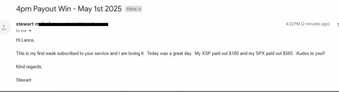 Does February 20th ring a bell to you? | That's the day the market began its almost 22% decline, wiping off trillions from the market over the span of 2 months. | However, it's also the day I took the first trade targeting a 4 PM payout with a small group of savvy traders. | And despite the ups and downs we've seen since then… | We've been able to take the market to the cleaners while leveraging a hidden anomaly with the power to pay out at the 4 PM close. | You see, these setups require zero oversight and have shown the power to deliver in the most chaotic market conditions. | Which means they close out automatically just before the market closes @4 PM. | But hey, don't take my word for it… | Here's a review from Stewart 20 minutes after he saw his first automatic 4 PM payout. | | We're seeing more opportunities for these 4 PM payouts opening up every day… | And now, I've laid out a detailed plan to show you exactly how it works. | Of course, we both know no one can guarantee wins or prevent losses, but… | If you'd like to get in with us on the next opportunity to target our next one.. | You can head over here, and I'll get you started. | -Investimonials | We develop tools and strategies to the best of our ability, but no one can guarantee the future. There is always a risk of loss when trading past performance is not indicative of future results. Stated results are from live published alerts between 2/20/25 and 7/28/25. The win rate has been 88.8% on the options with an average return of 14.43% over a six-hour hold time. |