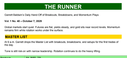 | | | The biggest AI wealth window in history is open right now. Every day you wait, someone else takes your trade. Click here before the next move hits. | | | Good morning, traders: | It's time to get active. It's time to find trades. On Friday, I recommended that investors tap into AMD (AMD). And whoosh - did our breakout screener find a winner? Shares surged a staggering 25% yesterday after OpenAI took a stake in the company… | What's next? | That's what the RUNNER is for - at 9 am every day. Each day, after we cover the biggest stories in the market, I give away the RUNNER - our top breakout and breakdown names for the coming day. Are you ready to trade? | Then join us in 15 minutes at Market Masters… At this link. | Here's what's on tap today.. | The AI Juggernaut Won't Slow Down… | With AMD surging on Monday… the question is… who's next? Today's your last chance to call into our team at TheoTrade to join my NVIDIA-4D Masterclass… at 2 pm. | Want in? All you need to do is call 623-244-5657. Just tell them "Garrett sent you…" | This morning, we'll talk about NVDA, TSLA, and more as the AI trade runs hot… | Gold at $4,000 | Wow… that's all I can say… The march to $4,000 happened WAY faster than I expected. But as you've seen, it's all about momentum. Some people are saying that Gold is now a meme investment… and who can blame investors for piling in? | Well, the rally isn't over yet… and there are plenty of ways to get still involved? | Want to know the top ways to trade and invest in gold today? I'll walk you through it… | Time to get active… I'll see you in the room at 8:45 ET. | Stay positive, | Garrett Baldwin | | Oh… and come get your RUNNNNNNNER! PureCycle up 8.5% yesterday… What will today's RUNNER bring? | | | |
