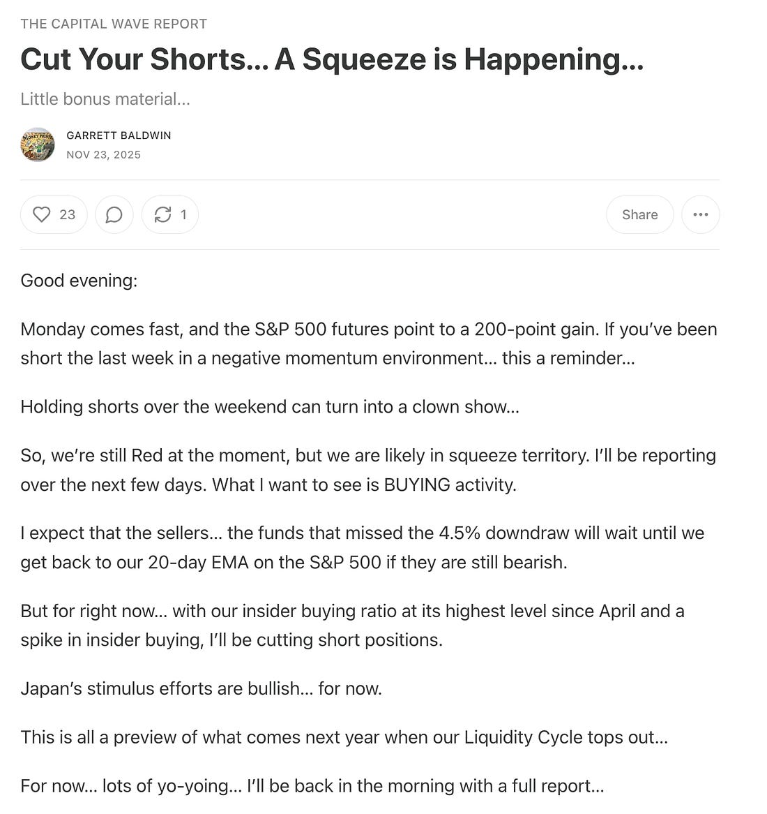 Good afternoon all: Our signal turned negative on November 13. Since then, there was wild volatility. We’re not out of the woods yet, but the signal showcased little buying pressure last Friday, which is why I wrote this… last night… So… let me make this easy for you. I’m offering you a 65% discount for monthly and annual subscriptions - and the deal never goes away so long as you’re a member… If you still need to know how this works… take a look… But… 67% off… It’s a deal… it’s a steal… Stay positive, Garrett Baldwin About Me and the Money Printer Me and the Money Printer is a daily publication covering the financial markets through three critical equations. We track liquidity (money in the financial system), momentum (where money is moving in the system), and insider buying (where Smart Money at companies is moving their money). Combining these elements with a deep understanding of central banking and how the global system works has allowed us to navigate financial cycles and boost our probability of success as investors and traders. This insight is based on roughly 17 years of intensive academic work at four universities, extensive collaboration with market experts, and the joy of trial and error in research. You can take a free look at our worldview and thesis right here. Disclaimer Nothing in this email should be considered personalized financial advice. While we may answer your general customer questions, we are not licensed under securities laws to guide your investment situation. Do not consider any communication between you and Florida Republic employees as financial advice. The communication in this letter is for information and educational purposes unless otherwise strictly worded as a recommendation. Model portfolios are tracked to showcase a variety of academic, fundamental, and technical tools, and insight is provided to help readers gain knowledge and experience. Readers should not trade if they cannot handle a loss and should not trade more than they can afford to lose. There are large amounts of risk in the equity markets. Consider consulting with a professional before making decisions with your money. |