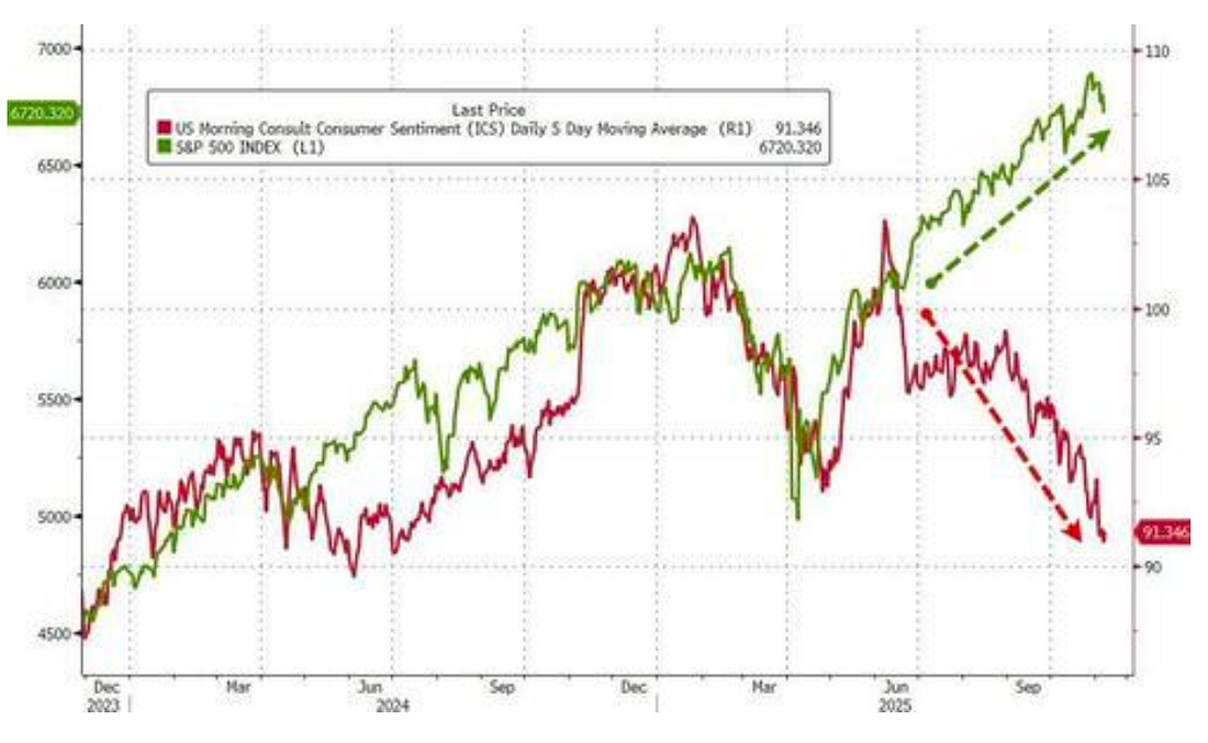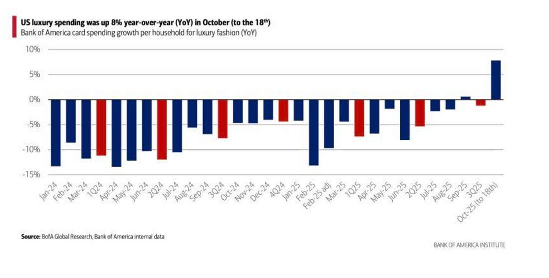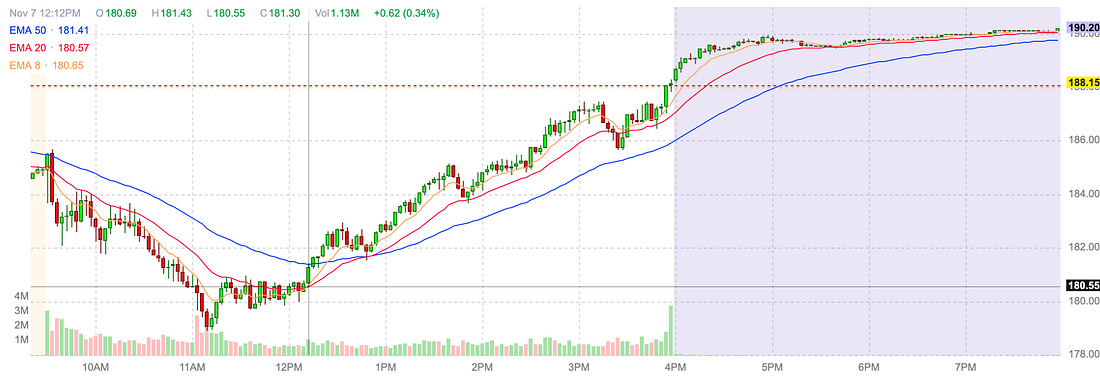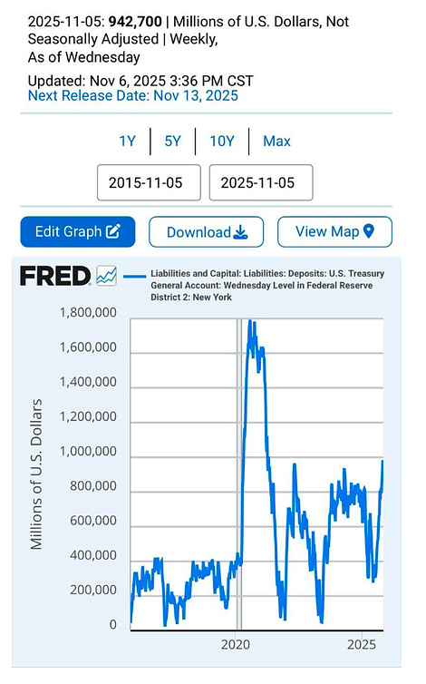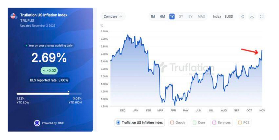 You are a free subscriber to Me and the Money Printer. To upgrade to paid and receive the daily Capital Wave Report - which features our Red-Green market signals, subscribe here. Bring the Ruckus... Bring the Chart Party... Buy Me More Toast...Saturday morning... with the dogs...Dear Fellow Traveler: I was sitting at the kitchen table this morning… my daughter was doing the dishes… Turns out that I can outsource my chores… It will cost me $10 today to have her do the dishes and wash the dog… While that might seem steep, this is solid arbitrage to start the day… That’s at least 2 hours of labor at below-market rates… and Maryland's minimum wage is $15.00. Watch me get sued… There are things that I don’t want to do… and then there are opportunity costs… I’m much better if I’m doing market commentary… instead of being irritated by chores. Chart 1: Don’t Go to the Post OfficeAs I think a tad about the market… I am not expecting this selloff to go too much deeper. But… this is why I follow the math equation… and not my own gut. Of course… there’s a single catalyst on which all of this relies… We bounced off the 50-day moving average on the S&P 500. The FNGD is gaining, but it’s still under its critical moving average. And we had a snap-back on Friday that is still haunting my dreams. I spent 105 minutes in a chat room yesterday talking about NVIDIA… and I said that the very second that the 24-minute EMA crossed the 60-minute EMA, the stock would rally. I had to go to the post office before it closed… Then… it happened… Orange line over pink line… compounded by blue line… NVIDIA $180 calls went from about two bucks to $8.15… and the $180-$182.50 call spread that I recommended but wouldn’t buy until that line crossed went up 60% in the time it took me to drive to the post office… I missed it… That could have bought a LOT of baseball cards… But I’m happy that the people who stayed in the room with Scott killed it… This is a very technically driven market… You must think like an algorithm. You must be patient. You must wait for a setup… You must stop selling things on eBay that require you to go to the post office… I know that people mock day traders… but success is possible if you follow rules and only make moves based on structure. Setting tight stops and admitting to yourself that there is a lot of luck in this fortune… I also sold those SH calls that I discussed the other day… at 62% and 75%…. And the SQQQ hero trade went up 218%… Take gains… I’m still short the dollar… and I feel pretty good about it… That’s up big because the UUP is the greatest vehcile in the world for dollar trades… All that said… the market is likely to rebound when the government reopens… There’s a reason for this… Chart Two: Son, Son…The Treasury General Account has been a HUGE drain on the system’s liquidity. It’s operated like a hurricane sucking water out of a bay. Well… it’s about to flood back… and it will do so… strongly… The natural tendency will be for institutions to lever up and buy NVIDIA (NVDA) stocks worldwide… and that makes sense given the way markets have worked post-COVID.... But I’m telling you that it’s time to focus on capital-efficient businesses and assets. I’m building a list for tomorrow… and I’m adding names like Domino’s (DPZ) and Toast (TOST). The latter is funny… I don’t know a single person in the restaurant business who liked using Toast software when it first started... People were so used to old school platforms… But… they came in… undercut everyone… and now… people who were skeptics are now saying… “Yeah. It doesn’t break. It doesn’t freeze.” I’ll take complacency in software platforms ALL DAY. “It doesn’t suck” is a reason to go long… We’re still a little ways from the top on the liquidity wave… I am not gonna get bearish until late 2026… Right now… the number of major emerging and developed market stock indices is at an all-time high… And that chart is interesting when you layer it over with the liquidity cycles… I wonder… what’s going to happen next? Chart Three: Why The Fed Won’t Cut… (Yet)Here’s an alternative data source… Truflation… It has inflation at 2.69%. Whoops… That seems … whoops… This is why a cut in December would be a wild one… The point I’ve made time and time again is that the Fed is very happy to enable asset inflation… but drive up the cost of key living expenses, and people pay attention… No one in power gives a shit about the bottom 90% of American consumers right now… (Except for the ultra-leftists who care, but have really bad ideas… and the libertarians who will NEVER take power and can’t unwind a Keynesian system…) Just to be clear and tell you how I really feel… Consumer sentiment is in the dumpster… but the S&P 500 keeps going higher… This is the great disconnect of a financialized economy… Look at the relationship between consumer sentiment and the stock market… There isn’t one. Politicians don’t care… I am reminded of something that happened in 2014… Back then, Gallup (or someone like them) did a poll measuring economic satisfaction in every state and Washington… On a scale from -100 to 100… each state had a rating. The No. 1 state at the time was… North Dakota. That’s because they were in the middle of an oil boom… And the rating was somewhere around 20… Then they polled Washington D.C. The Washington D.C. rating was PLUS 95. The people in D.C. were so disconnected from the rest of the country that they wondered why anyone was complaining. They were too busy benefiting from the government boom and the second round of Quantitative Easing… The Fed might not be expanding its balance sheet (yet), but the markets are benefiting from the continuation of Mnuchin-Yellen-Bessent short-duration issuance (U.S. debt is is