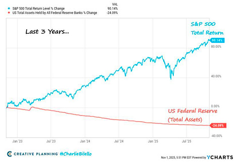 No… No. No… No… NO… “Dependent on QE to rise…” First… we’ve had a form of QE though… it just wasn’t the Fed doing it… It was the Treasury… Two, there was a massive correlation between QE between 2009 and 2014… And it was strong from 2014 to 2020… When the Fed dropped trillions from the sky in 2020 via open market operations… markets went up despite the economy being closed… Three… what has happened in the last three years that has fueled the S&P 500’s rally? An expansion in global liquidity… and the Treasury issuance that has helped fuel leverage. This was the missing puzzle piece that completely shifted my perspective on how this entire system works—and it was Michael Howell’s work. This is a chart of Howells showing that the Fed and the Treasury were quite active in helping provide supportive policies on the backside of the GILT Crisis and the Silicon Valley Bank crash… This chart showcases everything that you need to know about the support on the backside of the GILT Crisis… and we saw very loose policies from the central banks around the world. And as we look out into next year, the expectations are more support through the short duration of bill issuance, which has a massive leverage effect in equity markets. This chart above is likely why we’ll hit new all-time highs in 2026… Now… why am I saying this with conviction? I recall thinking the S&P 500 would fall from 3,800 to 3,250 in 2023 because of the relationship between the Fed’s balance sheet and the S&P 500… But then, after reading Capital Wars and Howell’s article in the Financial Times… I shifted my opinion and went long. I’m telling you… The shift from the Treasury has provided ample cover for the Fed. The Fed is about to loosen operations at some point. When that happens… BUY STOCKS I have other things that I want to say… But I’m going to keep them to myself right now. If you can’t say something nice… Stay positive, Garrett Baldwin About Me and the Money Printer Me and the Money Printer is a daily publication covering the financial markets through three critical equations. We track liquidity (money in the financial system), momentum (where money is moving in the system), and insider buying (where Smart Money at companies is moving their money). Combining these elements with a deep understanding of central banking and how the global system works has allowed us to navigate financial cycles and boost our probability of success as investors and traders. This insight is based on roughly 17 years of intensive academic work at four universities, extensive collaboration with market experts, and the joy of trial and error in research. You can take a free look at our worldview and thesis right here. Disclaimer Nothing in this email should be considered personalized financial advice. While we may answer your general customer questions, we are not licensed under securities laws to guide your investment situation. Do not consider any communication between you and Florida Republic employees as financial advice. The communication in this letter is for information and educational purposes unless otherwise strictly worded as a recommendation. Model portfolios are tracked to showcase a variety of academic, fundamental, and technical tools, and insight is provided to help readers gain knowledge and experience. Readers should not trade if they cannot handle a loss and should not trade more than they can afford to lose. There are large amounts of risk in the equity markets. Consider consulting with a professional before making decisions with your money. |