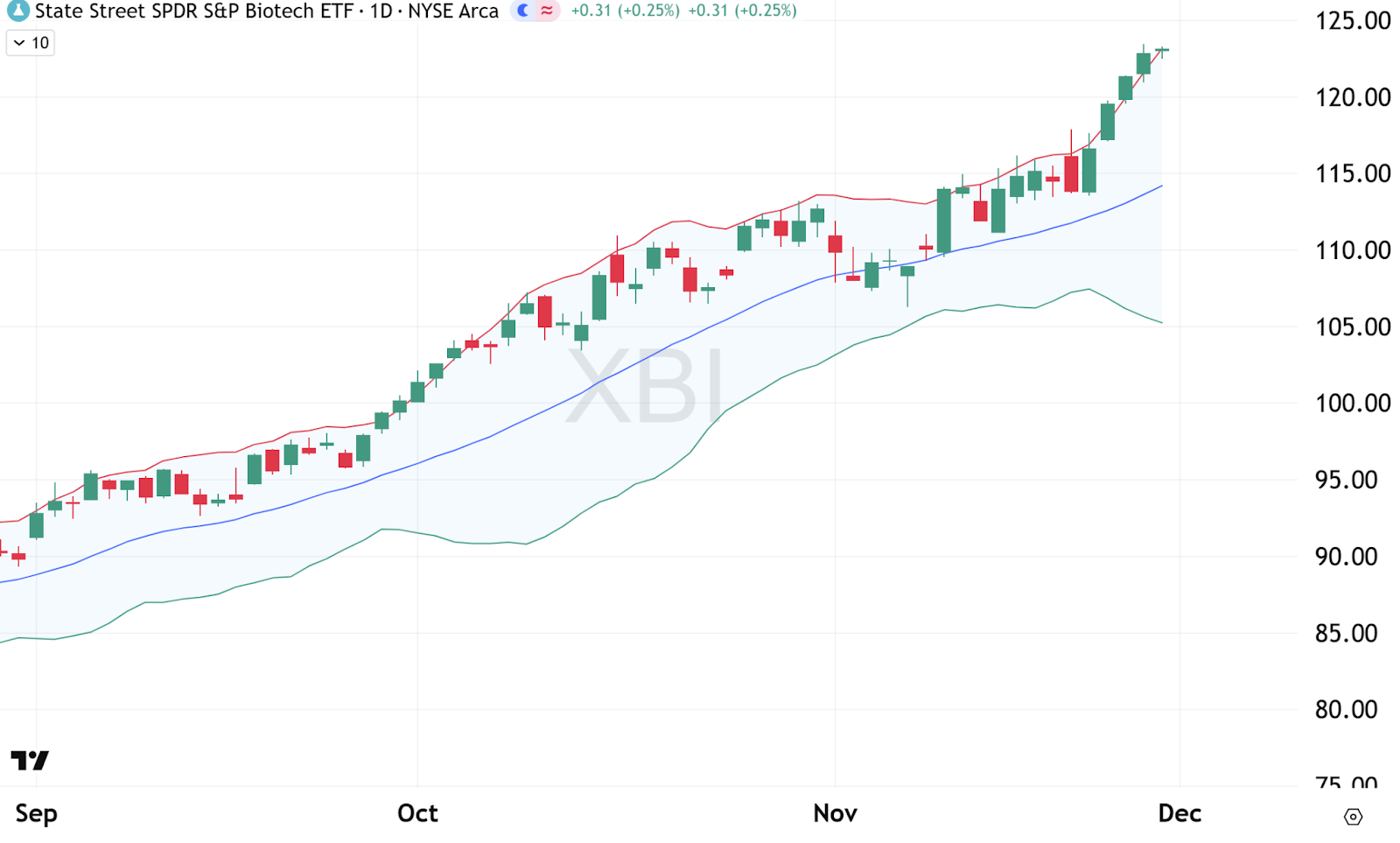 Biotech has exploded higher over the past week. XBI rallied from $107 to $123 in just four trading days. |