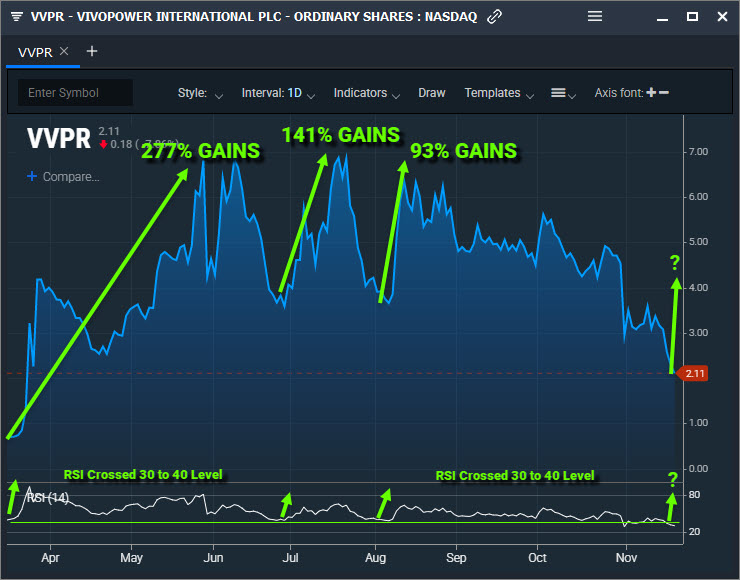 NOTICE: VVPR's RSI is at around approx. 30... if we're to see it once again crossover the same 30 to 40 level like it did in April, May, July, and August, it could be setting up for another potential double or even triple-digit gain like it has done multiple times.