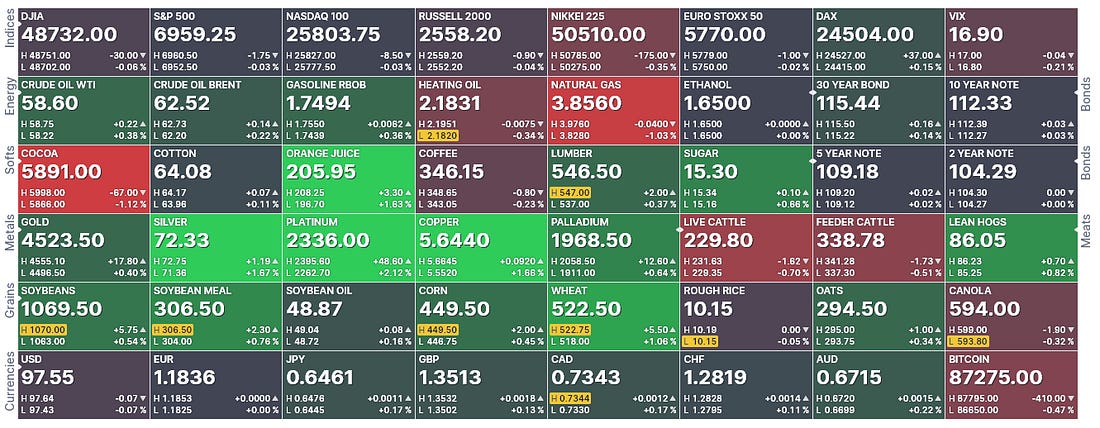 Twas the Trade Before Christmas...A little premarket rhymes for you to start this short trading day...Dear Fellow Traveler: I’m hoping you can get all your pre-market information from this poem… ‘Twas the Trade before Christmas, and all through the Street… Not a futures contract was moving, not even a beat. The Europeans had closed up their markets with care In hopes that some volatility would soon be there. The traders were nestled all snug at their screens While visions of thin volume haunted their dreams. With DXY flat and the Yen gaining ground The Dollar index traded in a tightly bound range. When out on the wires, there arose such a clatter, I sprang to ThinkorSwim to see what’s the matter. Away to the headlines I flew like a flash, To see if the Japanese were still hoarding cash. The glow of the candlesticks row upon row Gave a red-and-green luster to traders below. When what to my wondering eyes should appear, But gold’s touching forty-five hundred. Oh dear! With a little old driver so lively and quick… I knew in a moment it must be St. Risk. More rapid than algos, the headlines they came… And the wires whistled and shouted and called them by name: “Now copper! Now crude oil! Now JGBs falling! On Meta! On Silver! The contracts are calling! To the top of the range! To the all-time high wall! Now trade away, trade away, trade away all!” As dry leaves before the wild hurricane fly… When they meet with an obstacle, mount to the sky… So up to the highs the commodities flew… With copper at records and gold profits too. And then in a twinkling, I heard on the tape… That Trump posted growth was in excellent shape. As I drew in my head and was turning around… Down the chimney came Hassett without making a sound. He spoke of Fed chairs, all the candidates great, While precious metals were sealing their fate. The Chinese complained about chips and their plight… As Ukraine and Russia continued their fight. Bitcoin sat steady at 87-K. While Snowflake talked deals on this holiday. The BoJ minutes showed hikes coming near… The best gift for hawks at this time of year. He sprang to his terminal, gave it a whistle… And away the thin volume flew down like a thistle. But I heard him exclaim as he closed out his book… “Merry Christmas to all. Now go take a look… At those jobless claims data still coming today. Then rest up, dear traders. FOMC minutes hit Friday. May your P&L prosper, your hedges stay tight. Happy Christmas to all, and to all a good night!” Credit: I based all the premarket news on Zerohedge’s Newsquawk. Trader’s FocusMost institutional desks are done for the year, which means today’s half-day session is about algorithms and thin volume. Markets close at 1 pm ET and stay shut Thursday for Christmas, so if you’re not positioned already, there’s little reason to force anything in these conditions. The real story heading into 2026 is the repricing happening in hard assets. Silver is up 150% this year, and reports suggest spot prices closed at 78.49 in Shanghai overnight. Rumors of a physical squeeze are intensifying, with reports of failed deliveries circulating out of London. Gold is holding above $4,500, trading around $4,520, while platinum hit record highs amid tight supply. These metals are flashing an early warning signal. Either they crash back down to earth quickly, or everything else gets dragged higher to meet them. Back-of-napkin math shows an ounce of gold can buy roughly a railcar of coal right now... Continue reading this post for free in the Substack app |