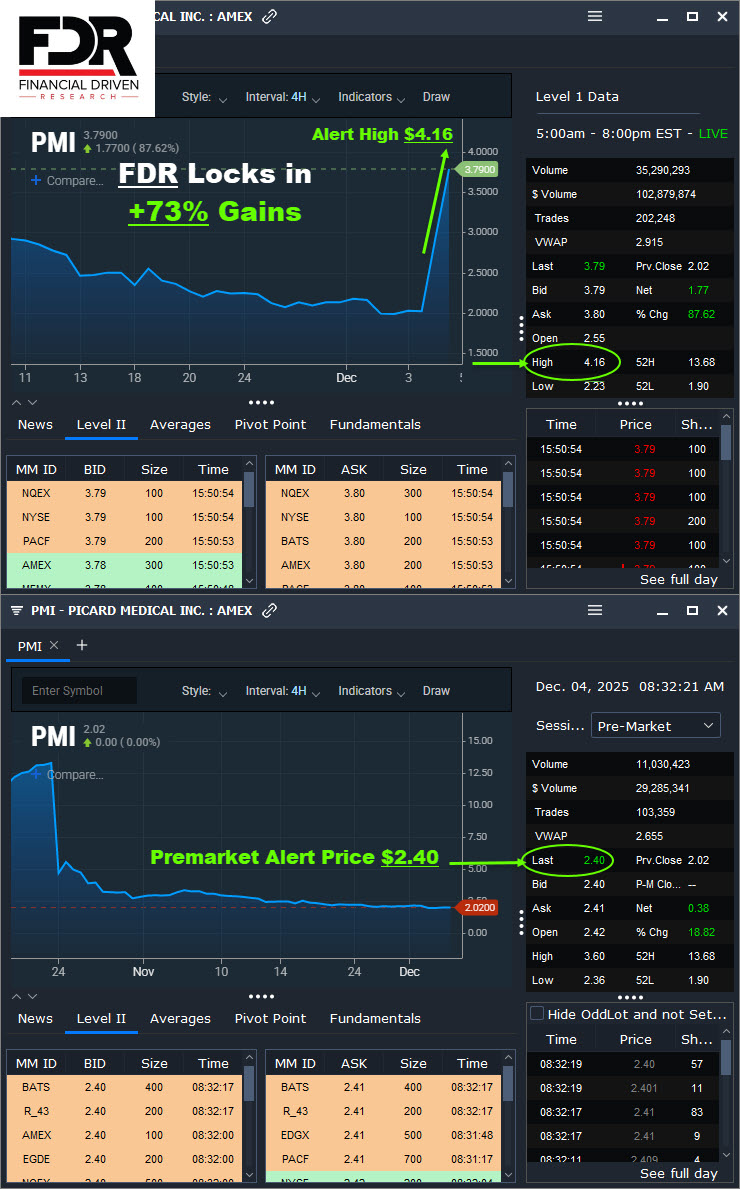 I alerted you PMI today December 4, premarket at approx. $2.40/share, and it rocketed to a high of $4.16/share, running up +73% in gains from my alert.
