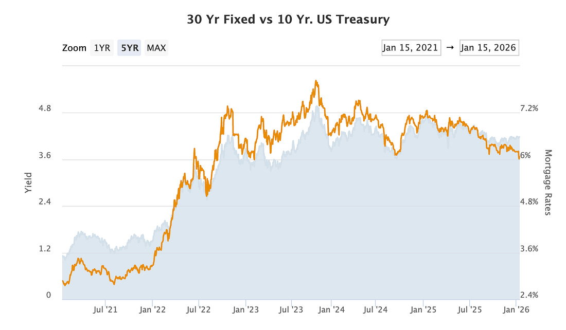 You are a free subscriber to Me and the Money Printer. To upgrade to paid and receive the daily Capital Wave Report - which features our Red-Green market signals, subscribe here. Dear Fellow Traveler: Mortgage rates are falling… That sentence feels weird, doesn’t it? The odds of interest rate cuts this month or in March have been falling. A lot more economists are telling us that we might not get a rate cut until June now… Powell never announced victory over inflation… has he? I mean, aside from that “Good Ship Transitory” comment that fell flat. The 10-year bond… is holding around 4.2%. But, interestingly, America’s most rate-sensitive market has loosened… What the what? (Mortgage rates on the right axis, 10-year yields on the left) Well… let’s take a look at what’s going on real fast with mortgage bonds. First… when banks issue mortgages, it typically won’t sit on that loan for the full 30 years. It will typically bundle thousands of mortgages into a wonderful little product called a mortgage bond. Institutional investors and others can buy that bond for yield, again a reflection of increased financialization of assets in the United States. Those bonds are critical to the plumbing in the housing market. If investors want them, mortgage rates will drop. If investors avoid them (think 2008), rates rise, and things can get intense for the market. It’s a simple way of thinking about it. Now, mortgage rates don’t completely depend on action by the Federal Reserve. They do depend on how easy it is for lenders to sell the mortgages they create and package. So… something happened here, right? It followed President Trump's announcement that he wanted U.S. housing agencies to purchase $200 billion in mortgage bonds. FHFA Director Bill Pulte confirmed on X that Fannie Mae and Freddie Mac would execute those purchases. It doesn’t matter if you support the actions or not… the outcome was inevitable. Here’s What Happens…The federal government told the market it intends to boost its efforts as one of the largest buyers of mortgage bonds. And when a giant buyer shows up, prices jump before they even start shopping. Traders try to get ahead of the order flow because it’s stupid not to trade this… Mortgage bond prices rise in anticipation. Mortgage rates dip amid expectations of a shift in mortgage bond prices... The announcement moved the needle. In the days following Trump’s directive, the 30-year fixed rate fell to 6.06%, the lowest in over three years. Again, that’s curious given the expectation that the Fed controls those rates, right? So, what happened after the announcement… Mortgage applications rallied over 28% in the next week. Refinancing activity surged by 40%. For one day, top-tier borrowers saw rates drop under 6% for the first time since 2022. Now, remember, this is not a Fed policy shift. It’s not quantitative easing (QE)… that’s a process in which the Fed creates new money and buys mortgage bonds and other assets. These Government Sponsored Enterprises (GSEs) are using the cash reserves they’ve built over the years during their years under conservatorship. Treasury Secretary Scott Bessent framed it as an offset… The Fed is letting about $15 billion in mortgage bonds roll off its balance sheet every month as part of quantitative tightening (QT). The GSE purchases are designed to neutralize that pressure. As Bessent put it, the idea is to “roughly match the Fed, which has been pushing the other way.” It’s the President using two government-controlled mortgage companies to push down borrowing costs amid a housing affordability crisis. You can argue about whether it’s wise and about what it does. It makes mortgages cheaper to fund, and cheaper mortgages mean lower monthly payments. But… it could also invite more buyers into the market and create greater demand for homes… We’ll find out if housing prices go up as a result (though it’s fair to estimate that they probably will) But the thing that isn’t what’s on my mind… We Need to Build…None of this solves the real issue. America doesn’t have enough homes for all these potential new buyers. Heck, my house had six offers… and that was in the middle of 6.5% rates… The country needs somewhere between 3 and 5 million additional units just to restore affordability, depending on whose estimate you trust. Lower rates don’t magically build new houses or convince people to give up the 3% mortgages they locked in years ago. (Ugh, I was at 2.6% in Florida…) What they do is keep demand alive. They keep home prices supported. They also keep shelter costs sticky in the inflation data. Banks will also have some breathing room on the mortgage portfolios that have been underwater since rates spiked. I think that’s the real issue at hand - a lot of banks need cash - and this alleviates some of that pressure if they did need to sell MBS. This is why the housing market continues to behave like it has its own private monetary policy. The Fed can keep rates elevated, and the 10-year can stay stubborn. But if the mortgage bond market heats up, and if the White House drops a $200 billion anchor into that pool, mortgage rates will drift lower regardless of what the central bank does. It looks like a rate cut, and it feels like one. But it didn’t come from the Fed. It came from the plumbing. Looking ahead, I don’t think MBS purchases will solve the supply-side issues. It will either need to come from one of two places. Significant reductions in zoning red tape (there are 25,000 agencies in America - though I’m using agency loosely as a term - that oversee housing zoning…) and I don’t foresee a bunch of people with a small amount of power to give up that control on where people can and can’t live… Or we port the mortgages - and allow people to transfer their rates over to new homes - which picks winners and losers… and theoretically would create more churn 