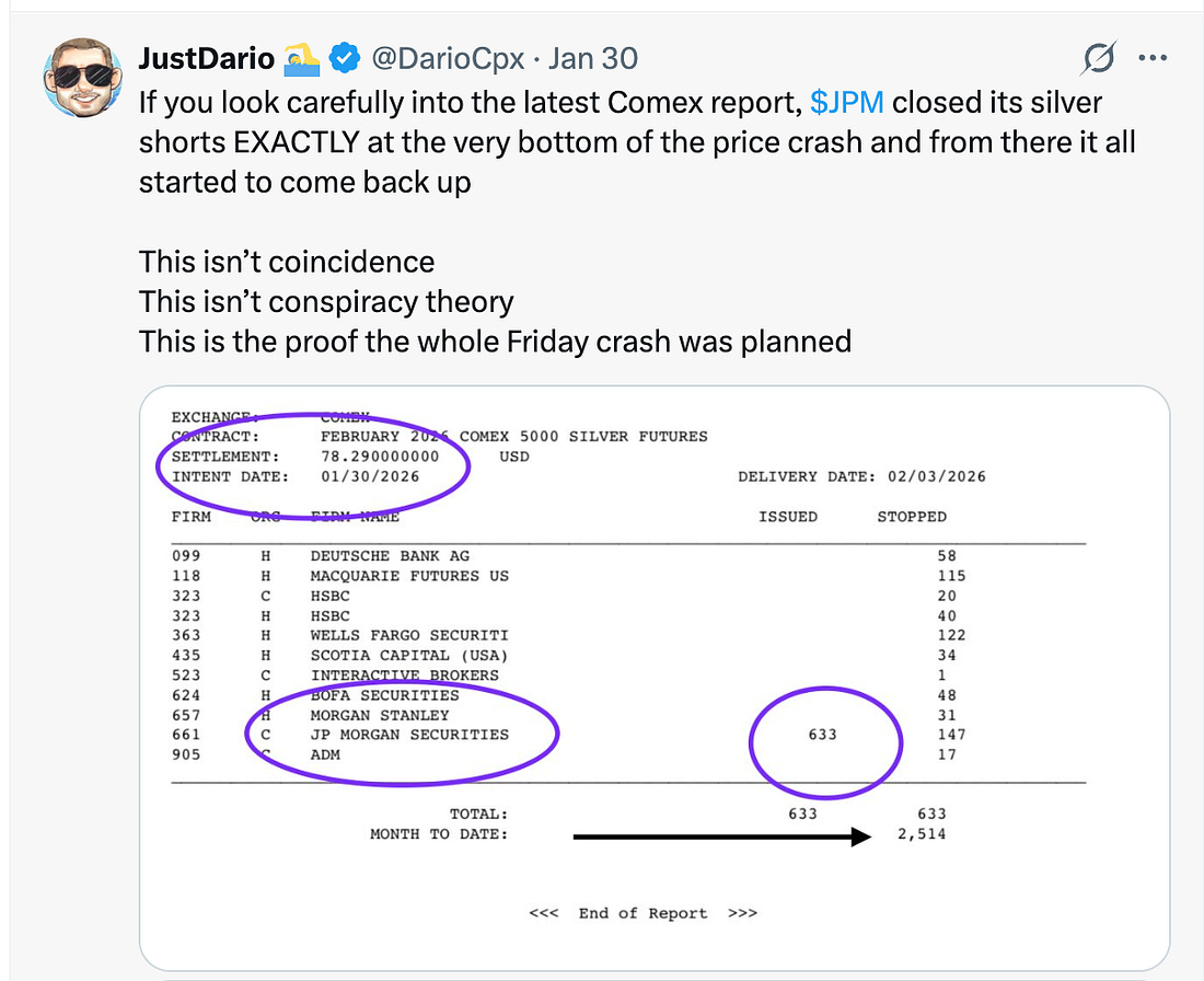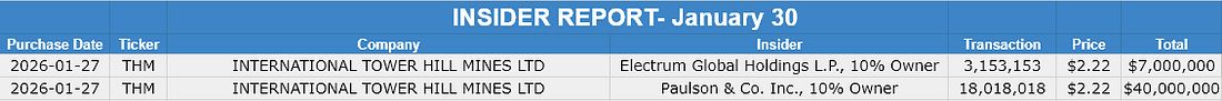 You are a free subscriber to Me and the Money Printer. To upgrade to paid and receive the daily Capital Wave Report - which features our Red-Green market signals, subscribe here. Dear Fellow Traveler: Well… the first event in the Money Pit came yesterday at the Edge of the World Farm. For the last few days, in the plunging Maryland cold, our HVAC was kicking out some colder air. The heat wasn’t going through, and the Heat Pump was constantly spinning into defrost mode… So, we called an HVAC emergency guy… He came over… touched a few wires, and went on his way. And it worked… for 15 minutes… just like socialism. Everyone was happy… the promise of heat and “warmth” if you will. Then it shockingly stopped working… just like socialism. (Couldn’t help myself.) The HVAC fuse blew… sparked… and kicked off a fish-like smell that meant it was time to shut off the heat. An emergency electrician (and a plunge in the house to 51 degrees while waiting) followed. He just kept saying… “You’re not gonna like what I charge…” as if his statements about service inflation in America were going to come as a shock to me. We’re on electric-only heat now, which is going to go great come our next BGE bill in March, in a state where they are still convinced wind and solar are the future. We’ll next pay for a new fuse box with all the bells and whistles. And, ain’t it funny… every repairman who comes in here is trying to sell me a maintenance plan… It’s almost like they’re actively engaged in the very extraction I explained over at Postcards for the last two months. The joy of homeownership… The American Dream. The land is still beautiful… which is what I really care about… From the Insider Buying Desk: John PaulsonI actively watch insider buying because nothing speaks louder than someone putting their own money where their mouth is. This week’s standout: John Paulson dropped $43.3 million on International Tower Hill Mines (THM), bringing his stake to roughly 42% of the company. The thesis? THM’s Livengood project in Alaska... one of the largest undeveloped gold deposits in the U.S. But the deposit also contains significant antimony reserves. Antimony was just added to the critical minerals list, and China controls over 80% of the global supply. Paulson made his name timing the 2008 housing collapse. When he moves this aggressively into a name, I pay attention. The gold-plus-antimony angle makes this particularly interesting from a supply security standpoint. For more, be sure to check out Insider Buying Report. Unusual Options Activity: The Smart Money’s FootprintsIt’s not just insider buying that matters… Tracking Unusual Options Activity (UOA) is one of the most important clues we can follow. Large, unusual options trades often signal what institutional money is doing before it becomes obvious in the stock price. This week, Unity Software (U) saw 11 extraordinary options activities hit the tape, with a sentiment split of 27% bullish and 45% bearish. That kind of heavy activity suggests someone knows something... or thinks they do… What’s the right way to approach this? For the best UOA analysis I’ve found, I recommend my friend Andrew Keene over at Alpha Shark Trading. Andrew has been in the options trenches for decades, and his ability to spot institutional flow is second to none. He was all over the big USAR activity back in October... caught it before anyone else. If you’re serious about following the smart money’s footprints, his research is worth every penny. So… Time to Go Long Dollar, Right?Traders couldn’t be more bearish against the dollar right now… So… go long dollar right? We’re seeing the premium paid for bets against the currency at its highest levels since Bloomberg began tracking in 2011. It’s now the most bearish on the dollar since May of last year… Feels like a fun contrarian play on the Invesco DB USD Index Bullish Fund ETF (UUP) for February 20. The $27 call for UUP on February 20 is… $0.15. Are you saying the dollar can’t move a little more than 1% over the next three weeks? For 15 cents, I’m willing to find out. The Buyback Industrial ComplexRemember all our conversations about financialization over the past few weeks… Here’s another example of what it is and how it drives markets… Since 2011, share buybacks have fueled 27% of S&P 500 returns. That’s not earnings growth or innovation. This isn’t about expanding multiples based on future cash flows. Where were you, DCF analysis, and all those MBA courses? Yeesh… It’s just corporations buying up their own shares (largely with cheap debt after COVID) and reducing that share count. This is fine. Pay no attention to the financial engineering behind the curtain. The market is totally healthy and definitely not propped up by accounting tricks. Nothing to see here. Is This What Happened to Silver? (Probably)Silver crashed a stunning 39% from Thursday’s highs... at one point nearly wiping out its YTD gains. It did bounce back solidly above $85 late in the day. JustDario notes that JPMorgan closed its silver short positions against the metal near the day's low. There are plenty of people arguing that this was intentional manipulation to help banks get out of short positions, especially given that some of these banks have paid massive fines in the past for manipulating the silver markets... Meanwhile, spot prices in Shanghai are 50% higher than what’s happening in the U.S. Won’t be surprised to see JPMorgan make a fortune going long from here… Here’s the thing… no one really cares. “Someone should do something!” screams the retail investor. “Investigate.” The lobbyist, economist, and regulator shrug… Even if they were caught doing something that seems sketchy… no one goes to jail… maybe a company pays a small fine. A cost of doing business… Hate to be that cynical about it… But that’s basically the history o