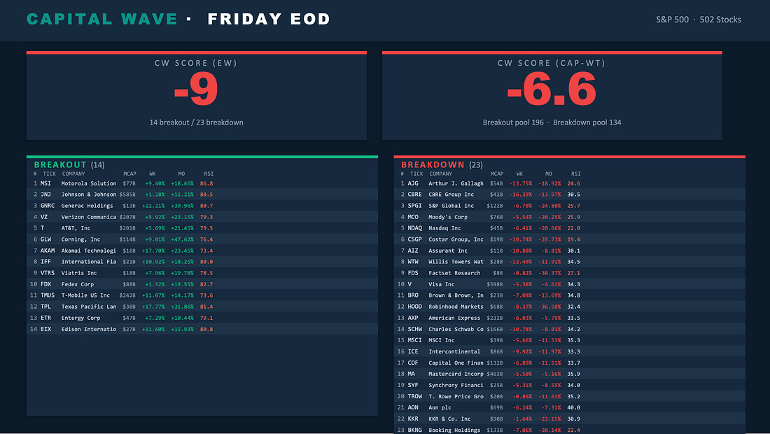 You are a free subscriber to Me and the Money Printer. To upgrade to paid and receive the daily Capital Wave Report - which features our Red-Green market signals, subscribe here. Dear Reader: Five years ago, a math equation changed my life. I was sitting in my office in Bonita Springs, Florida, staring at a spreadsheet that did not make sense. The S&P 500 had just hit record highs. Sentiment was euphoric. Everyone was buying. But a number - the result of the equation - said otherwise. I’d spent months building a scoring system that measured the internal momentum of the S&P 500. It was based on the academic work of multiple momentum experts. But I was adding my own flair to it… This wasn’t the index price, nor the headlines, nor what Jim Cramer was yelling about. It was all happening inside the 500 stocks that make up the index. On February 22, 2020, that number went negative for the first time. What followed was a 34% crash into the fastest bear market in modern history. I’ve been refining that system ever since. My father-in-law, Tim Melvin, helped me recognize the importance of the MACD's rate of change. Various books that we’d discussed by people like Grant Henning, Wes Gray, and Gary Antonnaci helped too. Now, I have my own figure… the Capital Wave Score. And, a screener that tells us the strongest momentum stocks and most negative momentum stocks right now… Yesterday, I pulled a 68% gain shorting BXP (BXP), and today I went after Mastercard (MA). A reader asked me to explain this score… what it does, and what it means. Happy to do so… Because right now, it’s telling a story that most peo’t hearing. What Is a Capital Wave Score?Every trading day, I score the entire S&P 500, all 502 stocks, through a quantitative system I call the Capital Wave Score. The output is one number. A directional score. Today, our score is Minus 9. And our cap-weighted score is Minus 6.6… Positive means momentum favors the bulls. The guts of the market, not just Apple, Microsoft, and NVIDIA dragging the index around, are trending higher. Negative means the opposite. The majority of stocks are breaking down. Sellers are in control. If that’s the case, the internal machinery of the market is deteriorating, even if the headline index has not yet caught up. That last part is critical. Because in every major market downturn I have studied, COVID, the 2022 bear market, the SVB crisis, the Japan Nikkei implosion, the internal momentum broke down before the index price confirmed it. I have been on air for four years doing this… so go back and check the tape. That gold crash The score caught it. Every time. How Does It Actually Work?I’m not going to give you the full recipe. But I’ll walk you close enough to the kitchen that you can smell what’s cooking. Step 1: Momentum Segmentation Every stock in the S&P 500 gets classified based on its weekly and monthly price momentum. I’m looking for coordinated directional moves across multiple timeframes. If a stock is up solidly for the week and the month, it shows breakout momentum. If it is down on both, it’s in breakdown mode. This is not a single moving average crossover. This is a multi-timeframe filter that separates real trends from noise. Step 2: Sector-Calibrated Scoring Here’s where it gets proprietary. Not every stock should be scored the same way. A utility does not behave like a semiconductor. A healthcare stock does not respond to the same forces as a regional bank. So I built scoring models calibrated to each sector. They weigh relative strength, volatility characteristics, price behavior, and fundamental factors, with unique weightings for eight different sector groups. A high RSI means something different for a tech stock than it does for a utility. The model knows that. Step 3: Volume Conviction Here’s what I have found is so important… Raw scores get adjusted by relative trading volume. This is the conviction filter. When a stock is screaming higher on twice its normal volume, that is institutional money moving. When it is drifting up on thin volume, that is noise. The volume adjustment amplifies real moves and dampens the fakes. Step 4:" The Cap-Weighted Overlay This is the part that kept me up at night for months. Capital Wave runs two independent readings in parallel. The CW Anchor looks at weekly and monthly trends. Anchor is just breakout stocks minus breakdown stocks. And for five years, that figure has done its job. But now we’ve added a weighted side… so the CW figure can be negative, but the weighted number is still pulling the market higher. This is a HUGE warning sign. The underlying parts of the markets are selling… but just a few names are doing the work as institutions crowd into specific names… When that CW figure is negative… and then the weighted cracks lower… Look out below. Think of it as the tide. Remember… The basic score treats every stock equally. Apple gets the same vote as Etsy. But the market does not work that way. Institutions move the mega-caps. Pension funds, sovereign wealth, and the big index flows. They show up in the cap-weighted numbers. So I run this second version of the score where each stock’s contribution is weighted by its market capitalization relative to the average. When the equal-weight score is negative, but the cap-weighted score is still positive, it means the average stock is breaking down, but the mega-caps are holding the line. That’s a warning. It means breadth is deteriorating. The generals are still standing, but the troops are retreating. When does the cap-weighted score also go negative? That is when I pay very close attention. Because it means the big money is leaving, too. Why the Weighting Matters More Than People ThinkLet me explain this with a real example. For weeks, our equal-weight score was negative while the cap-weighted score was positive. The average S&P 500 stock was losing momentum. Sellers were winning across the broad market.