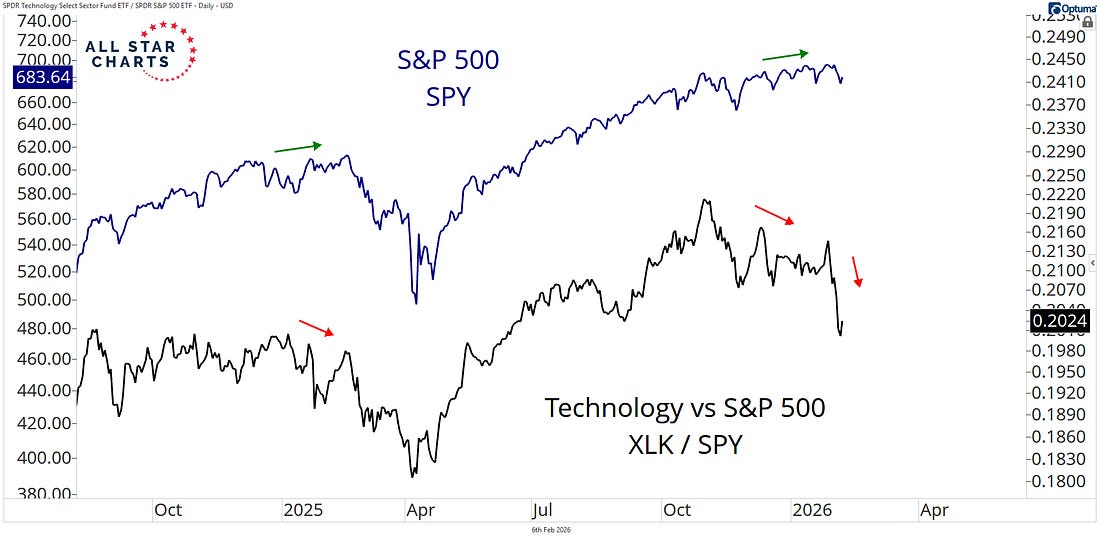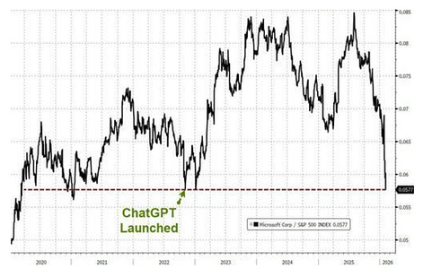 The point is brutal and simple: when you pay 8x or 10x sales (not earnings… but SALES!!!), you’re assuming the company can hand you every single dollar of revenue it generates for a decade. That means no costs, no taxes, no employees, and no R&D… and you’d still barely break even. The business could be incredible, and the stock could still destroy you because you overpaid. You’ve been warned… Chart 6: The Original Buy the DipIn my weekend reading, I found myself revisiting the Rothschilds while writing my latest piece for Postcards from the Edge of the World. Nathan Rothschild got stuck with a mountain of gold nobody needed after Waterloo ended too fast. His escape? Buy British bonds at 60... hold for two years while his brothers begged him to sell... exit above 80. A big gain… Feels like one of the great, original “buy the dip” moments… But here’s what matters for us... Britain funded that entire war by suspending gold convertibility, printing paper credit at home, and rolling debt forward forever. By 1815, the national debt hit 250% of GDP. They never paid it back. They just... kept servicing it. That wasn’t a wartime trick. It became the operating system. They had permanent debt… Private bankers became an essential part of the state's infrastructure. Financial repression became a regular policy. That’s the system Jerome Powell is still running, just with better spreadsheets. Maurice O’Shannassy wrote a fantastic deep dive on how this whole machine was built — go read it. Chart No. 7: So Goes Microsoft… So Goes…This is Microsoft’s outperformance against the S&P 500 since 2020. You can see that it’s regained all its lead on the Index since the launch of ChatGPT. It’s been wild to see everyone in the world become an expert on software companies over the last few days, as they talk about valuations and the impact of AI. Substack right now is rife with people saying that software names are cheap, etc. I’m telling you right now… AI is exponential… The real job’s impact isn’t here yet. But it’s coming. We’re already at a point where three guys with strong prompting skills can produce more content in a week than an entire 300-person media company. And if Microsoft is taking it on the chin… what do you think is coming? Claude’s legal platform (which I used last night) is exceptional in its early development. This thing goes into Metadata and can tell if contracts being offered are fresh or based on old templates that immediately create conflicts. Its scheduling and workflow elements are better than most enterprise software. Here’s the thing… they’re going to get tons of people to dump their Monday and Asana accounts and then JACK UP THE PRICE. Think Amazon on APIs. Anthropic will be the new toll road. Bookmark this and revisit in 12 months… after the IPOs happen. What’s On Tap This Week?Let’s look at what’s front and center for the coming trading period… MondayEarnings from Apollo Global Management… God save the Private Equity companies from themselves… This is a big one. Apollo matters because it’s a window into private credit and alternative asset flows. TuesdayThe earnings calendar is massive. Coca-Cola and McDonald’s are the consumer bellwethers. If McDonald’s reports that traffic is declining (not just ticket sizes falling), that’s a warning sign about spending at every income level. Coca-Cola will do a lot of heavy lifting in the consumer defensive sector, already crushing it since the October top for the high beta noise. WednesdayThis day will set the tone for the rest of February. The delayed January jobs report arrives in the morning. Five days late because of the government shutdown. The Street expects around 70,000 new nonfarm payroll positions and steady unemployment at 4.4%. Every signal pointing toward the labor market has been deteriorating. If the number disappoints, the entire market pivots to one question. Does the Fed have room to cut rates, or is the economy deteriorating without a policy response? We’re still WEEKS away from that March Fed meeting. ThursdayApplied Materials is the semiconductor equipment bellwether of the week. If chipmakers are still spending aggressively on manufacturing capacity, the AI infrastructure buildout is real. This unwind doesn’t feel over… but that’s just me. Coinbase will tell you everything about where crypto capital is flowing after Bitcoin’s 12% two-day plunge and subsequent recovery to $70,000 last week. The broader question around digital assets remains unresolved. Bitcoin has been acting more like a leveraged technology fund with no fundamentals than a hedge against anything. As I said this week… maybe that’s the point. FridayCPI. The big one. The monster! Expectations call for a 0.3% monthly increase in consumer prices and 2.5% year-over-year. Even that expected number is still above the Fed’s 2% target, which tells you the final stretch of this inflation fight is far from over. If the number comes in hot, rate cut expectations collapse and risk assets take another leg down. All right… Let’s call it a morning. Stay positive, Garrett Baldwin About Me and the Money Printer Me and the Money Printer is a daily publication covering the financial markets through three critical equations. We track liquidity (money in the financial system), momentum (where money is moving in the system), and insider buying (where Smart Money at companies is moving their money). Combining these elements with a deep understanding of central banking and how the global system works has allowed us to navigate financial cycles and boost our probability of success as investors and traders. This insight is based on roughly 17 years of intensive academic work at four universities, extensive collaboration with market experts, and the joy of trial and error in research. You can take a free look at our worldview and thesis right here. Disclaimer Nothing in this emai