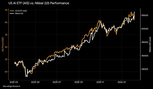 You are a free subscriber to Me and the Money Printer. To upgrade to paid and receive the daily Capital Wave Report - which features our Red-Green market signals, subscribe here. Next Time... Remember This Chart (Party)Friday's squeeze was technical... while Japan says that it's "Game On" for The Money PrinterDear Fellow Traveler: We’re hours away from the NFL Super Bowl, but the all-day television coverage started sometime in the middle of the night. Watch all-day coverage, and by the time the game kicks off, you’ll know the name of the kicker’s dog, how a spelling bee in 2001 gave a backup running back the courage to play football, and the names of 47 phone apps on which you can bet money today. I’m using Sunday to play catch-up after a long writing session yesterday on Postcards. Let’s start today with what happened on Friday. I had noted in the Capital Wave Report on Friday morning twice that we were moving into Squeeze territory and said I was looking for a squeeze during Market Masters, my morning show at 8:45 at TheoTrade. Why? Well, in recent periods of Negative Momentum, we’ve seen the markets shake out excess leverage and test a key moving average. In this case, it was a tap on the 100-day moving average on Thursday night at 7:30 pm, around the time that Goldman Sachs (GS) said the software application beatings had run their course. Here’s the S&P 500 off that key moving average. Markets look for those moments… The Squeeze brought us right back to equilibrium in terms of momentum. This isn’t the first time that we’ve seen this happen. So, in the future (especially on a Friday with many options expiring), we must look for markets to course-correct. Let’s look at more charts… MORE CHARTS!!! Chart Of the Week: Japan Is Driving the Bus...MacroEdge has great content for those of us who love charts and screaming at laptops over global economics. From Friday’s briefing, this chart “defeats all man.” This is a U.S. AI ETF basically entangled in the sheets like lovers with Japan’s Nikkei. What’s going on here? Exactly what we’ve been warning about. The weaponized Japanese Yen is funding the carry trade, which is funding the leverage in the AI trade. And as MacroEdge explains… “Bessent knows it. That’s why they keep pushing to weaken the yen.” Gianni Di Poce at TheoTrade and I were talking about Japan the other day, and we noted that its bond market just had yet another once-in-1,000-year event. Why does this keep happening? Because we aren’t prepared to deal with it, we keep stapling Frankenstein back together. Japan has been the primary driver of global funding woes since its market crash in August 2024. The U.S. and Japan did some emergency triage for SoftBank… and it’s becoming impossible to find a buyer for Japan’s debt. Tack on that its Prime Minister who wants to do MORE STIMULUS and run BIGGER DEFICITS just won on Sunday, and we can anticipate some wild times ahead. We’ve been warning about this transmission mechanism since August 2024. When Japan sneezes, America catches pneumonia. They are joined at the hip, according to the Bank for International Settlements. But get ready… things are about to get weird. Markets could absolutely surge tomorrow after the snap election produced a supermajority. It’s gonna get really loud, really soon… We’ll check the Capital Wave figure in the morning… especially after we moved back toward equilibrium fast on Friday. That said… as MacroEdge says, “When the yen carry trade finally breaks for good... the AI trade is going with it.” Chart No. 2: One Bitcoin... Many Claims...Bitcoin went from $120,000 to $62,000 in four months... Everyone’s screaming, “Wall Street broke Bitcoin!” Did they? James Lavish went to town on this one. This is another story about leverage. For every dollar of real Bitcoin trading... Seven and a half dollars of paper Bitcoin traded alongside it. For a long time, hedge funds ran a basis trade… They were long IBIT and short CME futures, and just pocketing the spread. Then they ran out of people to sell to… When it collapsed below the T-bill rate... they unwound. They sold the IBIT. That’s your “massive ETF outflows.” It wasn’t panic. It was math. And again, another sign of financialization and engineering. This has been going on across a wide range of markets. This is also why our signal on momentum is so important. When it goes negative, wild things tend to happen pretty quickly in these markets. Our last negative signal was January 28. Since then, gold and silver crashed, Bitcoin crashed, and we just had the worst momentum day in years. We know how to combine liquidity and momentum… Are you not entertained? I know… I don’t do Photoshop so good… As I’ve noted, BTC feels more like a place where funds can trade without much scrutiny. At least they’re not doing this with the food supply… they would… But BTC doesn’t offer any real friction. It’s a trade for leverage and momentum. And when liquidity and momentum stall, it blows up. It’s almost like it’s designed for people who like playing with matches… so they set up a sandbox for pyros far away from everyone else just trying to invest in fundamentals. From time to time, the flames spread. But it’s usually contained… Over at All Star Charts, we find evidence of a common discussion we’re having. Liquidity might be at all time highs, but high-flying momentum has broken down. Leverage around those big tech names, software, and BTC has unwound, all while money rotated into energy, materials, and consumer defensives. That rotation aligns with where we see capital moving throughout this cycle. I expect speculation will remain rampant around energy and materials in 2026. That’s common in this period, after the liquidity cycle starts to slow and then stalls. Tack on the U.S.-China mercantilist focus on raw materials from nations, and we could see wilder swings in anyt