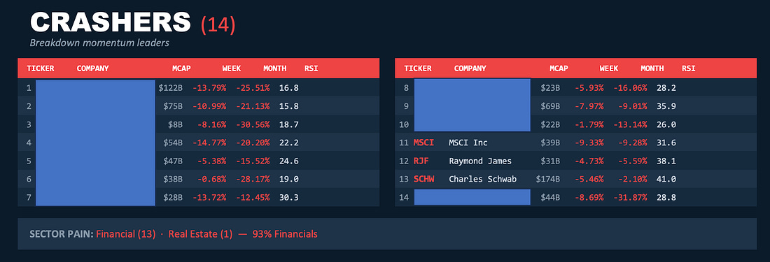 Ah.. yes… Efficiencies… and client’s needs. But really efficiencies… More than 700 people from the firm’s IT, knowledge, admin, DEI, leadership & learning, secretarial, marketing, and design teams are heading home... A lot of people are writing and talking about the ongoing story. Elon Musk thinks that AI and associated productivity growth are the only things that can pull us out of debt. But others wonder… would you take 15% productivity growth with a 15% unemployment rate (even though about 25% of Americans are ALREADY underemployed, according to alternative figures)? I'm focused on two different things. First, the psychological toll… what does it mean if we replace so many jobs and people might lose purpose? What do people do now? How do they handle this shift? I covered that issue over at Postcards last month. Second… what is the market telling us? And how will we catch the warning signs on valuations… Out of the SkyOver at Capital Wave Report… we’ve moved Yellow at the end of the day… But without even looking at the news today… one could tell that something was suddenly wrong. You’re looking at a list of the hardest momentum stocks on the other side of the bell curve… The names that could easily keep selling off as more investors throw in the towel. The thing about momentum… it creates more momentum, like a snowball rolling down a hill. Today, two names popped on there and I just said… okay… this is probably an AI move here… isn’t it? And it was… Raymond James and Charles Schwab. Both were getting torched today… The news? Well… there’s a new AI platform that can help users achieve greater tax efficiency. And when that happens… the whole idea around money managemenet gets shaken up. Schwab dumped 8% today, and hit our screen around 11:30. Raymond James followed. Here’s the story out of Bloomberg [emphasis mine]: