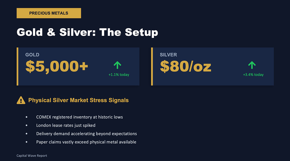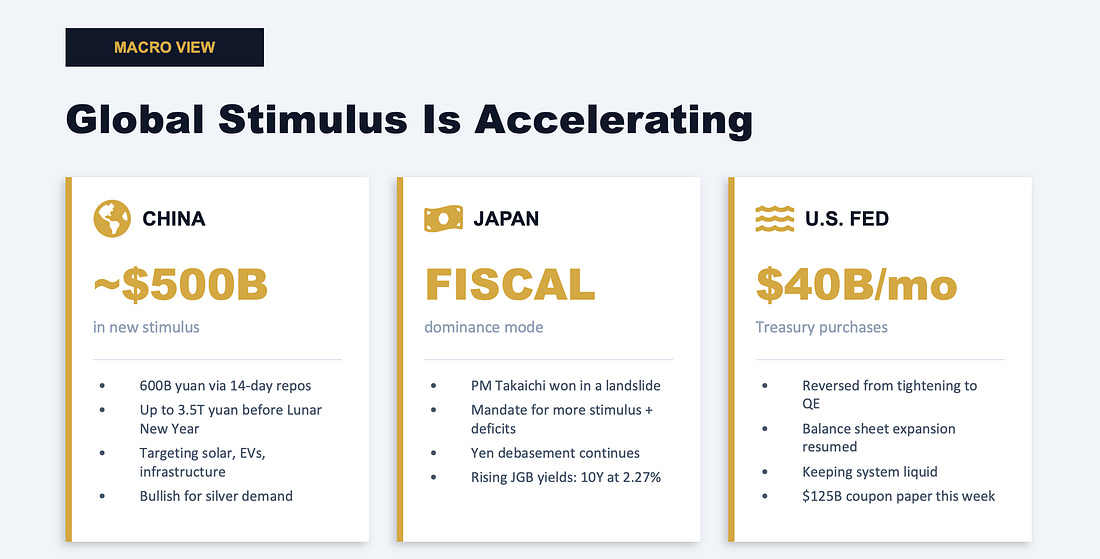 The BRRR Is Real... Here's Looking at You Silver...Oh look... China is injecting a half trillion dollars in Yuan into its markets... Strange.Good morning: Welcome to our many new members who joined us over the weekend. We cover a lot of ground here - but we’ve started to add some visual components to this, so take what you will… and leave the rest. When I say the word… “BRRR,” I’m referring to stimulus and looser monetary conditions. We keep a close eye on economic conditions and apply them where necessary. Well… I’ve said that China was due for a BRRR. And here it comes… In U.S. figures, the pump flowing out of Beijing is about $500 billion. Remember when we used to flinch at these numbers? They’re not messing around. Like the U.S., China is dealing with liquidity gaps. This should be bullish for resources… but I’m not gonna be shocked if Weibo (WB) finds its legs. Silver is back above $80 per ounce, and gold at $5,000. I have a feeling that they’re getting ready to break out once again - despite our deeper concerns about momentum at the moment. In late 2025, the Fed reversed course from tightening to balance sheet expansion, buying $40 billion a month in Treasuries to keep the system liquid. Japan is running fiscal dominance under a regime that guarantees continued yen debasement. Its sweeping election tells us that Japan will spend at all costs and run it hot, despite the threat of inflation and rising food costs. There’s a lot to unpack from that election. Yes, the Nikkei is at an all-time high, but this ongoing printing comes at a cost. It means we’re going to see… again… problems from Japan that affect the plumbing of the U.S. financial system. This has been a problem since at least July 2024… although some people can’t pick the island nation of Japan out on a map… Here’s Japan… Or is it? No… that’s Madagascar… Meanwhile, China is pouring stimulus into solar, EVs, and infrastructure that consume silver by the ton. And other resources should capture a bid as a result of printing. If you paid attention to my piece about debasement, the rule goes that we need to focus on scarce assets - not abundant ones. Don’t speculate on food… focus on silver, gold, and things that matter. Meanwhile, the physical silver market is flashing stress signals not seen in years. COMEX registered inventory is at historic lows. London lease rates just spiked. Delivery demand is accelerating on a trajectory that would have been unthinkable two years ago. Paper claims on silver vastly exceed the physical metal available to back them. Something has to give. Welcome to Groundhog Day. Speculation in commodities will dominate 2026. Now, let’s get to the Capital Wave Score… And our list of breakout and breakdown stocks... Continue reading this post for free in the Substack app |