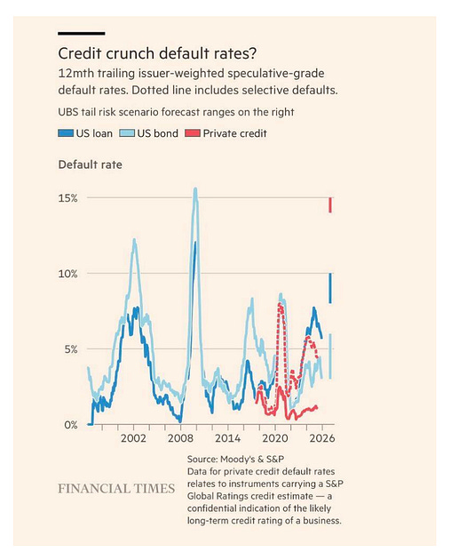 You are a free subscriber to Me and the Money Printer. To upgrade to paid and receive the daily Capital Wave Report - which features our Red-Green market signals, subscribe here. Dear Fellow Traveler: This will sound ridiculous given everything we’ve been talking about... the repo injections and the Japanese bond meltdowns and the $525 billion in liquidity that nobody wants to call Quantitative Easing (QE). But I need a minute. Because tomorrow is March 1... The grass is being cut in Florida and Arizona, and somewhere right now, a 22-year-old kid who was pitching in Double-A last August is standing on a mound trying to throw a slider that breaks three inches more than it did in September. Nobody in the world is watching him except a pitching coach with a radar gun and a dream. Baltimore author and crank H.L. Mencken used to write about baseball the way others wrote about cathedrals. He’d go to Ebbets Field, the Polo Grounds, the old parks that smelled like peanut shells and cigar smoke and spilled beer on concrete... and he’d write about the geometry of it. He’d talk about the diamond, the distances, the “60 feet, six inches” from the mound to the plate, and 90 feet between the bases. Those numbers haven’t changed since 1893. People looked at these dimensions 133 years ago and said... That’s great. Leave it. There’s something in that. We spend most of our time now trying to understand markets and systems that are redesigned in real time. It feels like the Fed changes its balance sheet mechanics every quarter. Japan rewrote its accounting rules so insurance companies didn’t have to admit the value of their bonds. Private credit funds invented new structures to avoid marking losses. The rules have changed constantly… Baseball rarely does that (see the extra-innings rule, which has worked out). The strike zone moves around a little depending on who’s behind the plate, but the game is the game. You get three strikes, four balls, three outs, and nine innings. A .300 hitter is a .300 hitter in 1926 and in 2026, and when someone tells you a pitcher has a 2.85 ERA, you know exactly what that means without needing a footnote explaining that the methodology was revised in December. That’s why the statistics matter so much to people who love this sport. It’s not that we’re nerds... although we are... It’s that the numbers mean something because they’re measured against a fixed standard. A home run in 1955 and a home run today traveled over the same fence. In finance, we can’t even freaking agree on what inflation is. In baseball, a strikeout is a strikeout. There’s a clarity to that which borders on spiritual. My dad gave me my first pack of baseball cards in 1986. Topps. I remember flipping to the back of every card and reading the stats... batting average, home runs, RBIs, stolen bases... and not understanding most of it but understanding that these numbers described something real. Learning to read a box score was one of the first five things that my father taught me… and I still look at them all the time. Something that had happened on a field, in front of people, and been recorded and printed on the back of a card that I could hold in my hand… That’s what baseball cards and box scores are… They’re proof that the game happened and the rules were the same. That someone stood in a batter’s box on a Tuesday night in July and hit a ball over a wall, and it counted. It’s proof that Paul Skenes is the best pitcher in the game. In a world that increasingly feels managed, adjusted, revised, and rewritten... there’s something reassuring about a box score. I’m romanticizing a sport where grown men throw and catch a ball for money. I get it… But sometimes the simple thing is the true thing, and the true thing is worth protecting. Opening Day is March 27 this year (I don’t like counting those games in Japan…) That’s 27 days from now… someone is going to throw the first pitch of the season, and for a few hours the world is going to be organized around something that makes sense. It’ll all be binary… Fair or foul. Safe or out. Win or lose. There won’t be any footnotes, revised methodology, or “technical adjustments.” Fathers are going to sit next to sons and daughters in stadiums across the country, and those fathers are going to try to explain the infield fly rule, and fail, because nobody can explain the infield fly rule on the first try. And on Opening Day, my daughter will eat a hot dog and not care, and remember the day forever anyway. That’s the transaction. A kid, a hot dog, and a game that hasn’t changed. I’ve spent months writing about systems that require $525 billion in coordinated intervention to stay upright. I keep rambling about systems where the rules get rewritten so losses don’t show up. We live in a place where the question “is this a free market?” doesn’t get an answer. Baseball’s market is pretty free… You stand in the box, and the pitch comes. You swing, or you don’t. And nobody adjusts the outcome after the fact. Nobody reclassifies a strikeout as a “technical adjustment to the batter’s performance metric.” You’re out, or you’re safe, and it’ll be the same box score in 50 years. I love simplicity… Now… let’s look at the charts… Chart No. 1: We’re In a Financial Crisis… Act Like ItWe’re doing five charts today that are really important. I’ve been saying that the data shows we’re in a financial crisis… Not a 1929 Depression. Not a 2008 implosion. But a real financial event with liquidity under pressure and defaults rising. This is the UBS number we wrote about in "Is This a Free Market?" Matthew Mish raised his worst-case projection for private credit defaults to 15% in late February, up from 13% just four weeks earlier. This red line is pretty intimidating... That’s the tail risk forecast ranges… Remember, Blue Owl has already gated investors in OBDC II bec