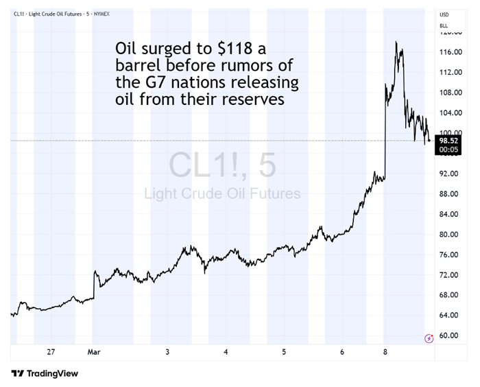 | That's why oil shot up to $118 in the overnight trading session. And it would likely have remained there had the G7 nations not discussed releasing 300 million barrels from strategic stockpiles. If agreed upon, this would represent a quarter of stockpiles. |