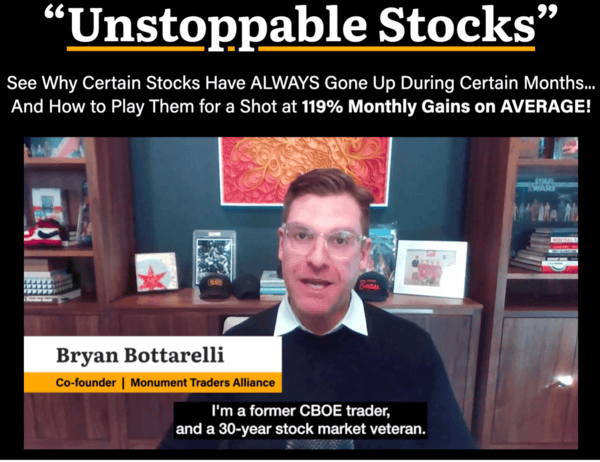 | Dear Reader, Bryan analyzed all 5,704 publicly traded stocks in the U.S. market over the last five years… And found something strange. A single play that's averaged a 99% gain every April since 2021! Plus another that's averaged 92% every May for 5 years… And similar "unstoppable plays" for every month of the year In all, they've averaged 119% wins each month for 5 years straight – with a 98% success rate. Which means if you'd known about this a few years ago, you could've potentially averaged a 119% win in 59 months out of the last 60. Now, past performance doesn't guarantee that the same plays will keep winning… But if they do, it could be a fantastic few years… and it all kicks off April 1. He's got the details on these super plays here (plus the free ticker for April's trade) - take a look before it's too late. Yours in smart speculation, Ryan Fitzwater CEO, Monument Traders Alliance P.S. You have to get in on the 1st for max gain potential. So hurry and get the free ticker now. |