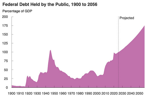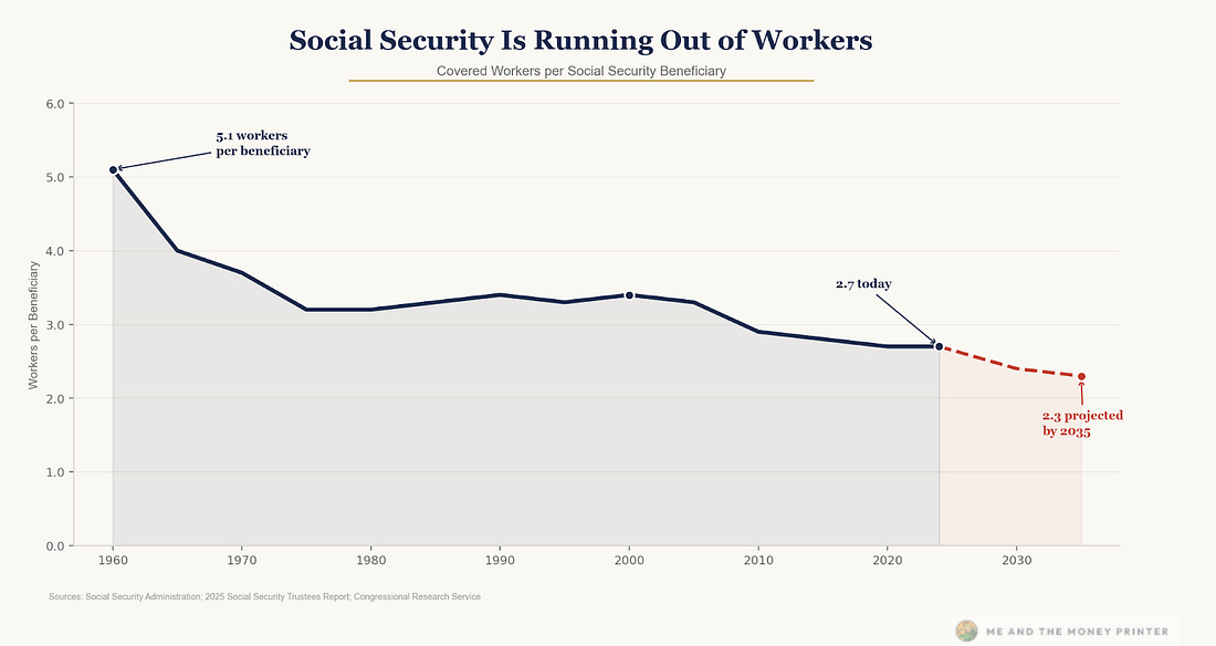 This would, over time, start to affect not just retail investors holding annuities but also broader pension systems already under strain and facing deficits. Municipal pension holes in cities like Chicago and Los Angeles are already straining budgets, and higher taxes to fill existing gaps have fueled voter flight. Combine existing pension holes with duration risk from private credit, and the crisis is obvious. Again, this is just one part of a story that is part of a deeper puzzle. Consider that Social Security is slowly cracking from the other side. The worker-to-beneficiary ratio, once around 5-to-1, is projected to fall to roughly 2.3-to-1 over the next decade, according to the Social Security system’s own studies. Source: Me and the Money Printer, Social Security Administration Many workers are pessimistic about the future of Social Security, and claiming behavior is beginning to cluster aggressively around the earliest eligibility age of 62, accelerating the very depletion they fear. A recent survey and study by Northwestern Mutual suggests that 27% of Gen X workers and 39% of Boomers will take early benefits despite the 30% haircut on what can be obtained at the official retirement age (67 if born in or after 1960). The top reason for this behavior is concern about the sustainability and expected payouts of the largest retirement payment program in most Americans’ lives. At the same time, AI may accelerate these pressures at the margin by compressing entry-level income growth and shrinking the pipeline of workers paying payroll taxes. Recent data has shown large monthly swings in labor force participation, with hundreds of thousands exiting in a single month. Multiple legs of retirement funding are facing pressure. Savings can erode due to private credit losses. In contrast, income can erode as Social Security is depleted, and tens of millions of Americans discover that both of their retirement backstops are eroding. Congress likely won’t be able to cut benefits because it would be political suicide. While Congress could raise taxes enough to cover the gap, those transfer payments would come from younger constituencies already affected by decades of policy mismanagement. They would act as a further tax on incomes at a time when most people struggle with the cost of living. So, we expect the system to do only what it knows how to do. The system would likely expand the monetary base for now because every alternative is politically or economically worse. This process isn’t linear. Market cycles can go longer than fundamentals justify. Meanwhile, policy responses can delay outcomes without resolving them. Based on prior crises, we imagine that the Treasury could issue new debt, the Fed would buy it, and they would call the effort something new, like the “Retirement Security Facility.” The mechanism is the same as Quantitative Easing, which aims to stabilize the system and achieve outcomes similar to those of similar policies. That said, we could eventually witness the largest balance-sheet expansion in history because the political constituency for retirement security is the most powerful force in democratic politics. Simply put: They vote. I had previously expected the U.S. to use another emergency, such as “climate change,” to expand the Fed’s balance sheet or issue short-term Treasuries in large quantities. Further monetization is expected, and the Congressional Budget Office (CBO) forecasts rising debt. Deficits are expected to run at an annual rate of 5.6% to 6.7% per year from 2027 through 2036. Source: Congressional Budget Office This crisis is obvious… and one that could dominate Federal Elections in 2028 and 2032, as older voters ask what is so common today: “What are you going to do for me?” In addition, Social Security doesn’t have a pile of money in a vault. It has Treasury bonds, which are IOUs the government wrote to itself. As withdrawals exceed contributions, the system redeems those bonds, meaning the Treasury has to issue new debt to pay retirees. That means every Social Security check is now, functionally, financed by the same strained debt market, repo plumbing, and leveraged hedge-fund basis trades that dominate the financial plumbing of our markets. Should tensions expand, a likely response is some form of monetization and fiscal repression. The Fed’s purchases flood the system with liquidity, asset prices recover on paper, but the entry ticket to the American middle class gets more expensive at exactly the moment when AI is compressing the wages of the generation trying to buy it. The 25-year-old who can’t find an entry-level job because AI has eliminated those roles is now even further from affording a house. The balance sheet expansion required to save their parents’ pensions would only further inflate every asset class above them. Now, this is a scenario, and not a certain outcome. However, these types of situations are debated at the Federal level and are starting to happen in various financial planning discussions across the nation. That is why the Hedge is necessary. And why we believe the obvious defense against future monetary expansion and debt growth is to own “economic chokepoints.” When the Fed is forced to expand the balance sheet again, scarce assets reprice the fastest, and those that sit at bottlenecks collect a toll on every dollar that flows through. Many elements of this scenario are already visible in the data. The question is less whether it unfolds than how. This is a lot to unpack… But I want to talk about how the system really works and why it’s more important than ever to have a plan for its mechanisms… Lyn Alden appeared on Peter McCormack’s podcast last week, and I finally had a chance to watch it last night. I think that if you’ve read Postcards on my extraction arguments and Me and the Money Printer on the mechanics of this system, you’ll find a lot of familiar territory. Lyn just happe