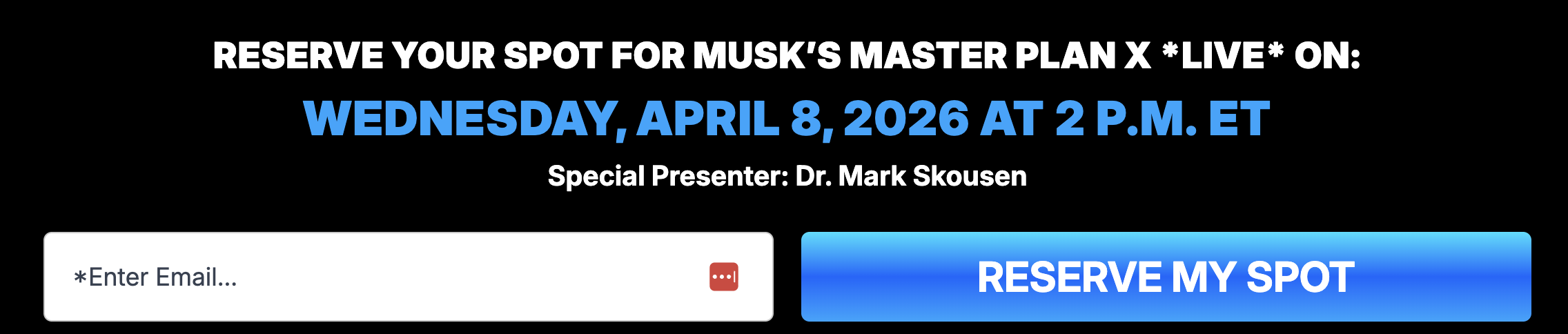 | Dear Reader, "Insane." "Ridiculous" "Out of his mind." That's what people are saying about what Elon Musk is doing next. But people have always doubted Elon. Neil Degrasse Tyson called SpaceX a "delusion" back in 2015. Now SpaceX is about to IPO at a $1.75 trillion valuation… the highest ever. In fact, Musk has made so many investors rich over the years that they coined a new term for it… Teslanaires. So forgive us for getting excited when Musk announces three groundbreaking new launches to hit before the end of April. This could be a BIG moment for investors once more. Which is why we're inviting you to this special event hosted by our friends at The Oxford Club, Musk's Master Plan X. It's free to attend. And it starts on Wednesday, April 8 at 2 p.m. ET. To your wealth, Stephen Prior Publisher, Monument Traders Alliance |