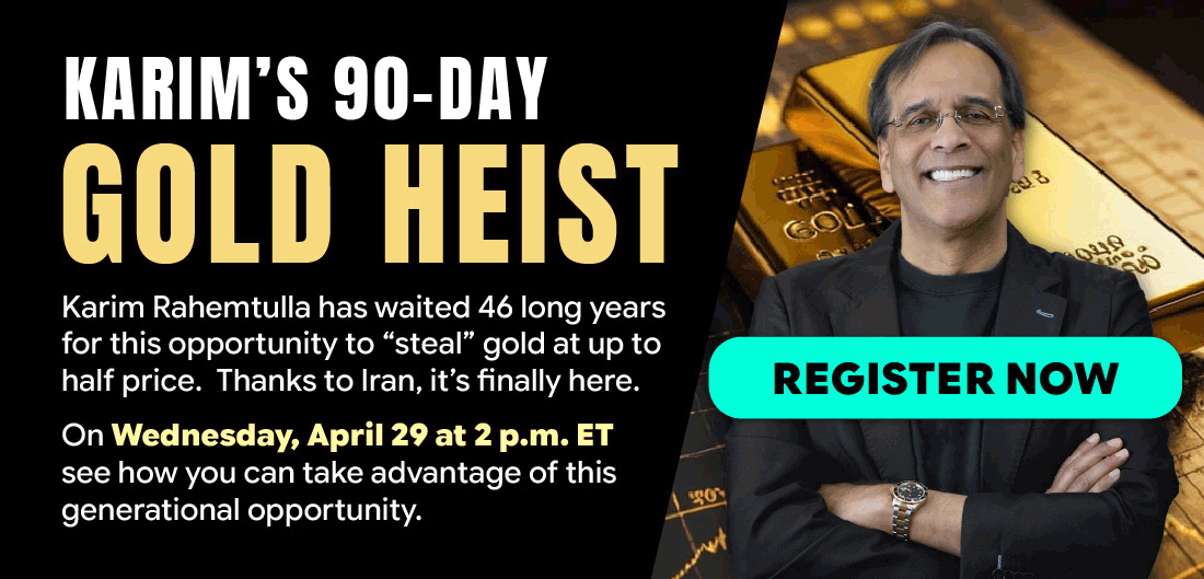 A Note From Publisher Stephen Prior: Iran is panic-buying gold at any price and driving miners to record highs. Karim Rahemtulla has spent 46 years waiting for a setup like this one. On April 29 at 2 p.m. ET, he goes live to show you how to own the world's best gold assets at 30% to 50% less than what others are paying right now. Registration is free, but seats are limited.