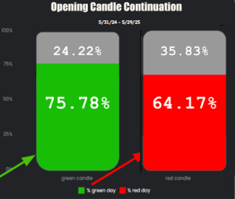 A study revealed that since 2024, when the opening candle was green, the market closed higher 75.78% of the time.