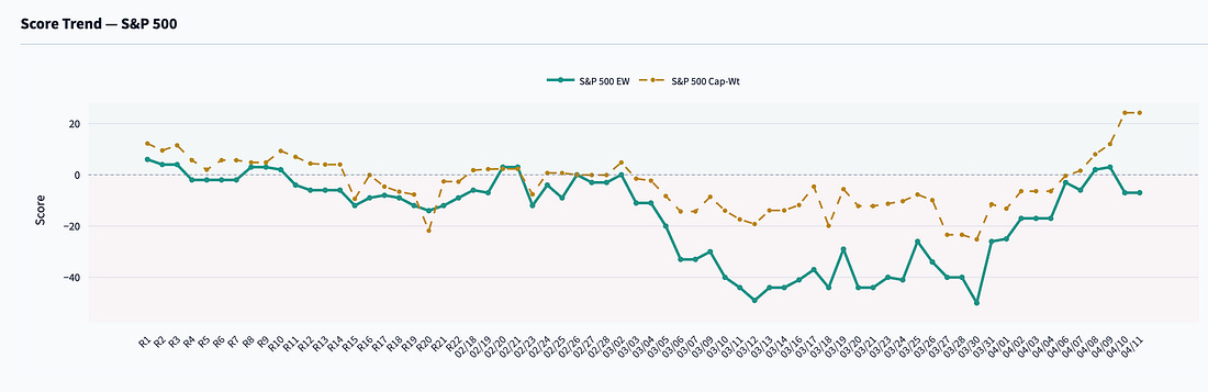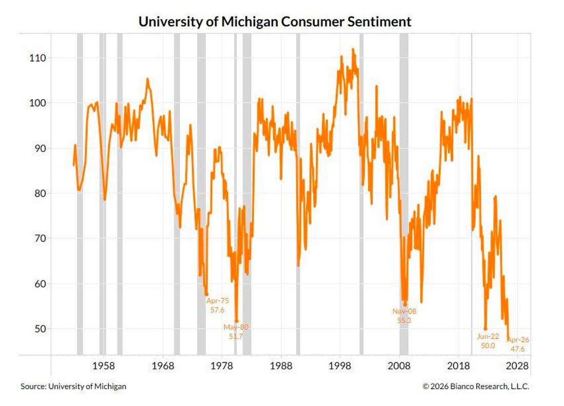 Dear Fellow Traveler: Well… what a turn of events. My cranky eight-year-old daughter didn’t want to go to her lacrosse game today. She said she wasn’t having fun… So, I told her that her teammates were counting on her… and she wanted to play this year. She went… and she was not very polite about it all the way to the game. Then… they needed a volunteer. They needed a goalie today. And she threw up her hand… She allowed only three goals in the half she played and made an incredible save to end it. One of the saves where the other parents look at me and ask… “Was that a hard save?” And I just shake my head and say… “Yeah, that was almost impossible…” Then she played midfield and immediately scored… Then, after the game, the snack that parents brought was “donuts.” What a turn of emotions this child had… We went from volatility to calm and joy… She was the emotion of the stock market over the last week… The thing that really caught me off-guard. The ride home. “I had so much fun playing goalie…” she said. “I want to play goalie again.” Hoo boy… I don’t know how my parents handled me as a lacrosse goalie for a decade… But it’s harder to be the parent of a goalie than to be a goalie yourself… Who knows… maybe one day she’ll be sending you emails too, telling you that her defensive signal turned negative or positive… Which brings us to this week… Let’s Chart Party… Chart No. 1: What Do You Want? “My Face on the One Dollar Bill…”Well… what can we say… the market roar on Wednesday was CLEARLY in the Money Printer Pro dataset on Monday and Tuesday… A collapse in negative selling pressure happened last Friday, followed by a positive reversion on the Russell 2000 on Monday and Tuesday. Our Cap-Weighted reading went positive on April 6… Even if we had extreme fear that President Trump might “end a civilization…”, institutional flow said that they were betting on the TACO Trade… That’s what we do… even if we are confused… This breaks our bias… Which is the point… Chart 2: “I'm only laughing on the outside… My smile is just skin deep… If you could see inside, I'm really crying… You might join me for a weep.”A funny thing happened on the way to the software valuation collapse. Two months ago, we talked about the drop in valuations that took us into the 7x range. As I explained… There was a possible move down to 5.5x or less based on the historical behavior… What’s really interesting about this chart isn’t that these valuations are at 4.6 today. It’s where they were in 2020 and 2021…. Why does it matter? Because the valuations started to expand in 2018-19 when the Fed cut rates and started another round of easing. Then, after the COVID collapse, it goes wild… all the way up to 17x. That’s bubble territory - and all clearly linked to the massive liquidity wave that was unleashed after the pandemic… only to quickly correct in 2022 when the cycle started to go in the opposite direction. Chart 3: ‘Where Does He Get Those Wonderful Toys?”Here’s Friday’s close… We now have a negative reading on the S&P 500 with a positive weighted cap. That just means the S&P 500 is getting yanked higher by the names in the Magnificent 7… this week, the MAGS popped nearly 5%. We should exercise caution, as the figure suggests that the probability of a negative reversion is on the table. That means… lower highs… and lower lows. Don’t blindly follow this rally… Chart No. 4: “It's Me, Sugar Bumps.”Submitted with little commentary… Another year of this is coming in 2027… Time to buy a year’s supply of Mellow Corn. Chart 5: “Wait till they get a load of me!”This is the productive part of the economy in the equity market… We’re not down at lows we haven’t seen since the great burst of financialization and passive investing started in the 1990s… Can this go to under 10%… Probably… Especially if we print a ton of money, and triple-leveraged Solana and Bitcoin ETFs go to the moon… Chart No. 6: “You Weigh a Lot More than A Hundred and Eight”Well, American consumer morale is pretty low…We’re at levels we haven’t seen since the late 1970s… The question now is whether Kevin Warsh will go the route of Volcker… use monetary policy tools to get this economy to bottom out… I’m not sure what’s going to bring this back… but it’s telling you something when consumer optimism is WORSE than it was at the height of the Great Financial Crisis. Seems like there’s a problem with our money… Chart 7: “The Pen Is Truly Mightier Than The Sword!”The thing that this chart doesn’t explain… is WHAT the military will spend money on. The Iran War has shown us the shift in warfare on the back of the Ukraine-Russia war. The future of warfare will be found in the scale of cheaper technologies… This isn’t about aircraft carriers and ground troops. It’s about drone technologies that can take out a tank from 20 miles away… and lots and lots of drones… I continue to argue the optimal name in this space if Lockheed Martin (LMT) for defense… but if and when they do increase monetary expansion, the name to own will be Kratos (KTOS). It’s down 20% in our Postcards portfolio… but that was after a rather manic rally took the stock at the onset of the year. The drones are the point… Chart 8: And now, folks, it's time for "Who do you trust!" Hubba, hubba, hubba! Money, money, money! Who do you trust? Me? I'm giving away free money. And where is the Batman? HE'S AT HOME WASHING HIS TIGHTS!Debt expansion drives equity markets higher… Just the way it works. What we are trying to avoid at all times are those contraction periods… that’s where leverage in the bond markets pulls back, margin buying stalls, and refinancing issues start to emerge. We’re heading into that part of the cycle right now… But don’t worry… They’ll monetize again